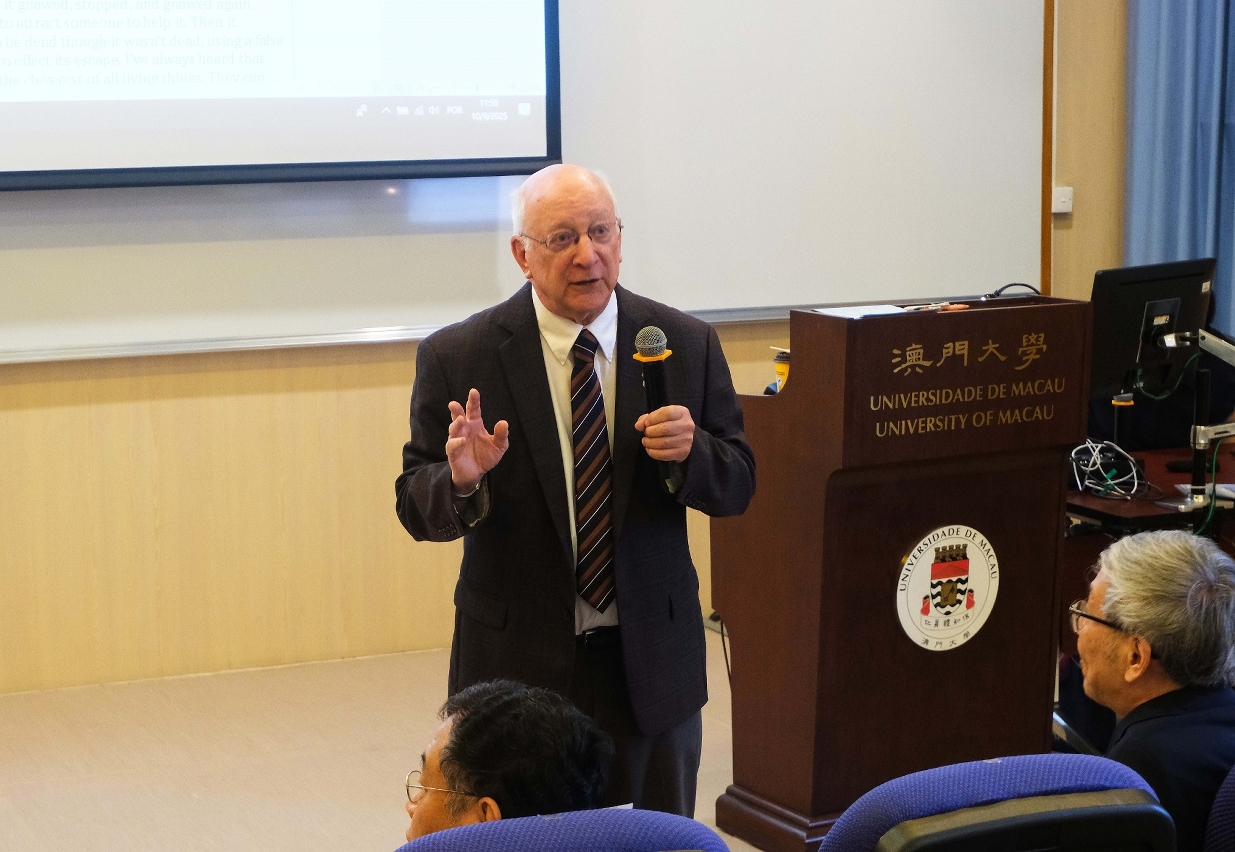 The Faculty of Arts and Humanities (FAH) at the University of Macau (UM) held the Macao Humanities Forum, where Ronald Egan, the Stanford W. Ascherman, M.D. Professor and Confucius Institute Professor of Sinology in the Department of East Asian Languages and Cultures at Stanford University, delivered a lecture titled ‘A Forgotten Literary Colloquy: Qian Zhongshu, Su Dongpo, and Cyril Drummond Le Gros Clark, Sarawak’s Chief Secretary in 1935’. The lecture was well attended by students and faculty members.