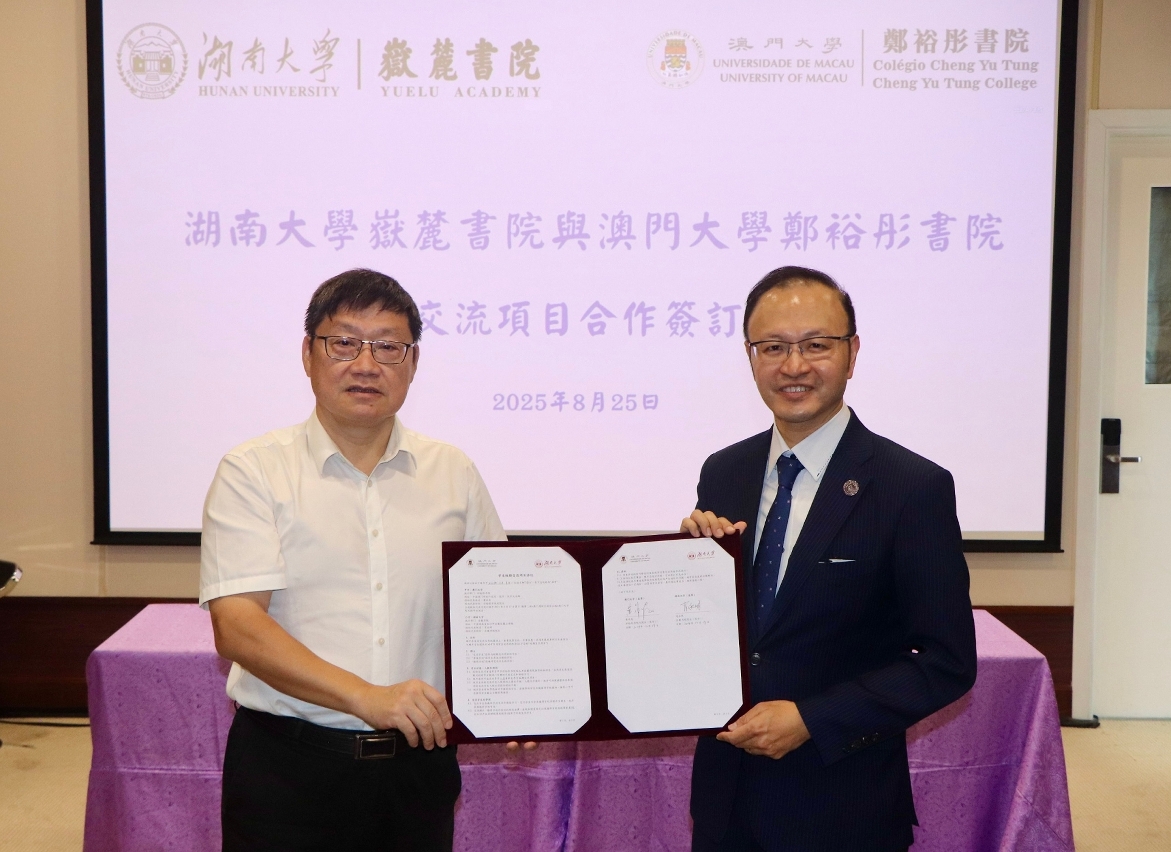 Students and faculty members from Yuelu Academy of Hunan University made a reciprocal visit to Cheng Yu Tung College (CYTC) of the University of Macau (UM). During the visit, the two colleges signed a student exchange agreement to facilitate annual short-term exchange trips for students from both sides.