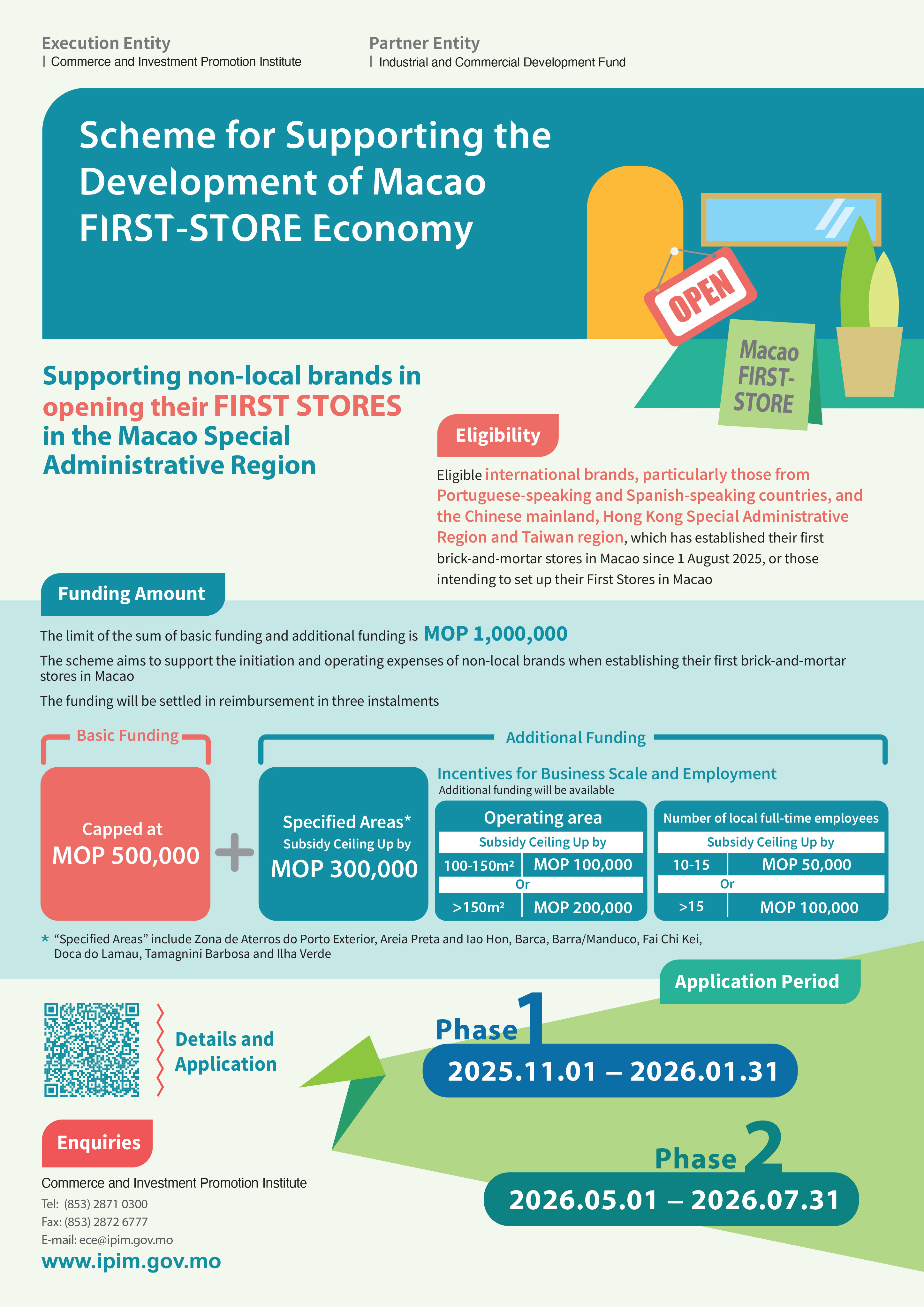 The "First-Store Economy Scheme" lasts for three years and consists of six phases of applications. The deadline for the first phase of applications is 31 January, 2026. Interested enterprises may submit their applications in person at IPIM during office hours or electronically. For more details regarding the "First-Store Economy Scheme", please visit IPIM’s website at [https://www.ipim.gov.mo/] or scan the QR code on the promotional poster. You may also contact IPIM on (853) 2871 0300 during office hours or by email at ece@ipim.gov.mo.