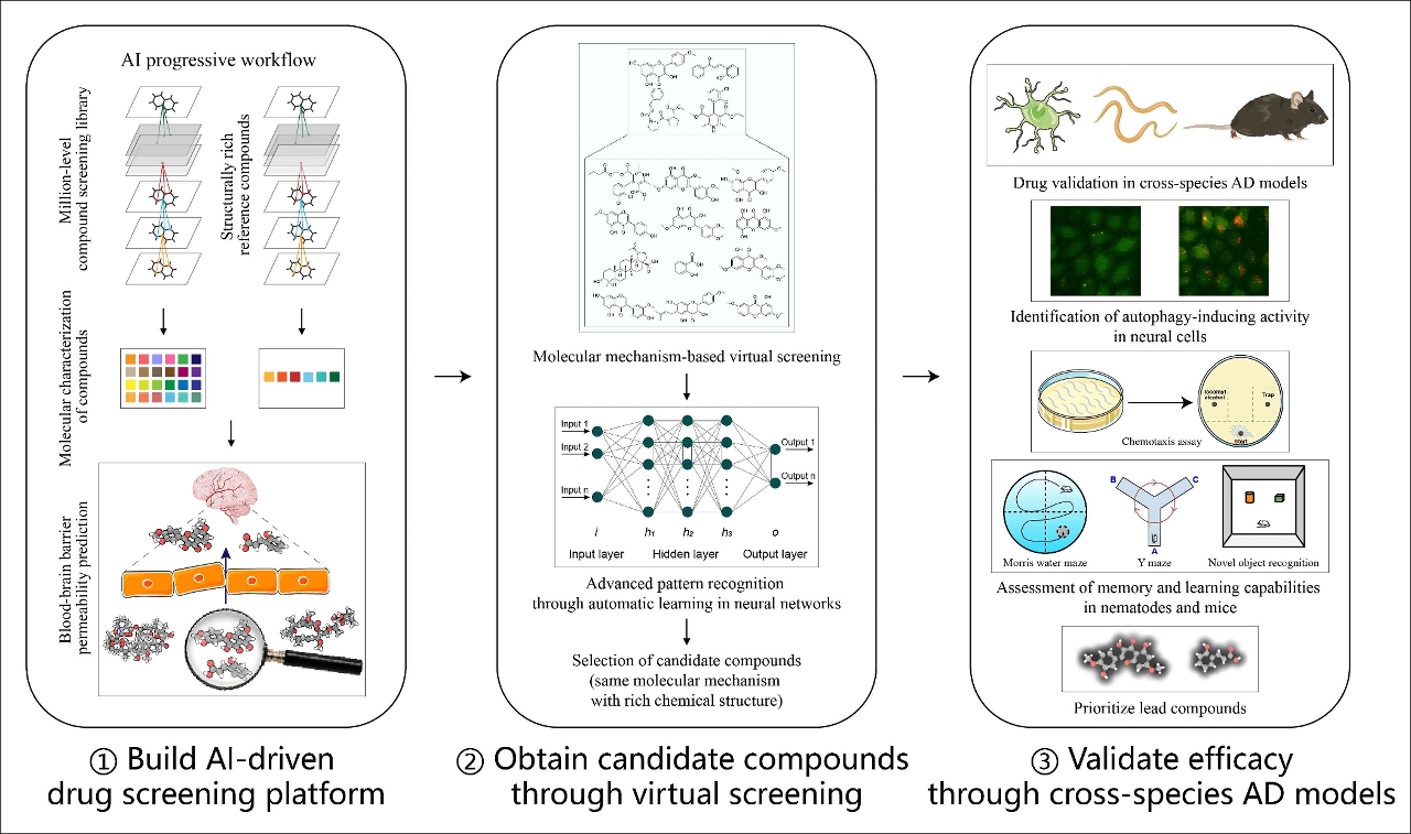 A research team led by Lu Jiahong, deputy director of the Institute of Chinese Medical Sciences (ICMS) at the University of Macau (UM), in collaboration with Hangzhou MindRank AI Technology Co Ltd and Imperial College London in the UK, has developed an AI platform that integrates a million-compound library and multiple predictive modules for the discovery of bioactive ingredients in traditional Chinese medicine (TCM) and natural products. The team used the platform for virtual screening, followed by cross-species experimental validation, to identify small-molecule TCM compounds with therapeutic potential for Alzheimer’s disease (AD). The findings have been published in the top-tier international journal Nature Biomedical Engineering.