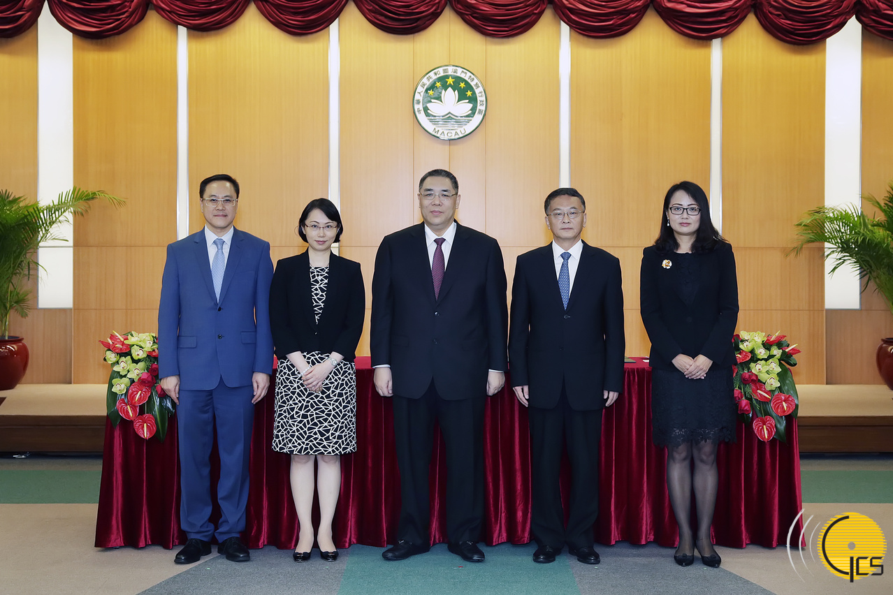 • Chefe do Executivo, Chui Sai On, preside à cerimónia de tomada de posse do director e subdirectores dos Serviços de Estudo de Políticas e Desenvolvimento Regional, Mi Jian (2º à dir) , Ung Hoi Ian (5º à dir) e Lin Yuan (1º à dir).