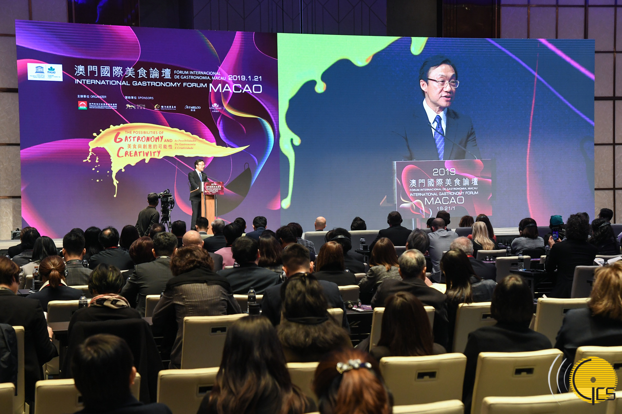 • Secretário para os Assuntos Sociais e Cultura, Alexis Tam, na cerimónia de inauguração do «Fórum Internacional de Gastronomia, Macau 2019», co-organizada pela Direcção dos Serviços de Turismo.