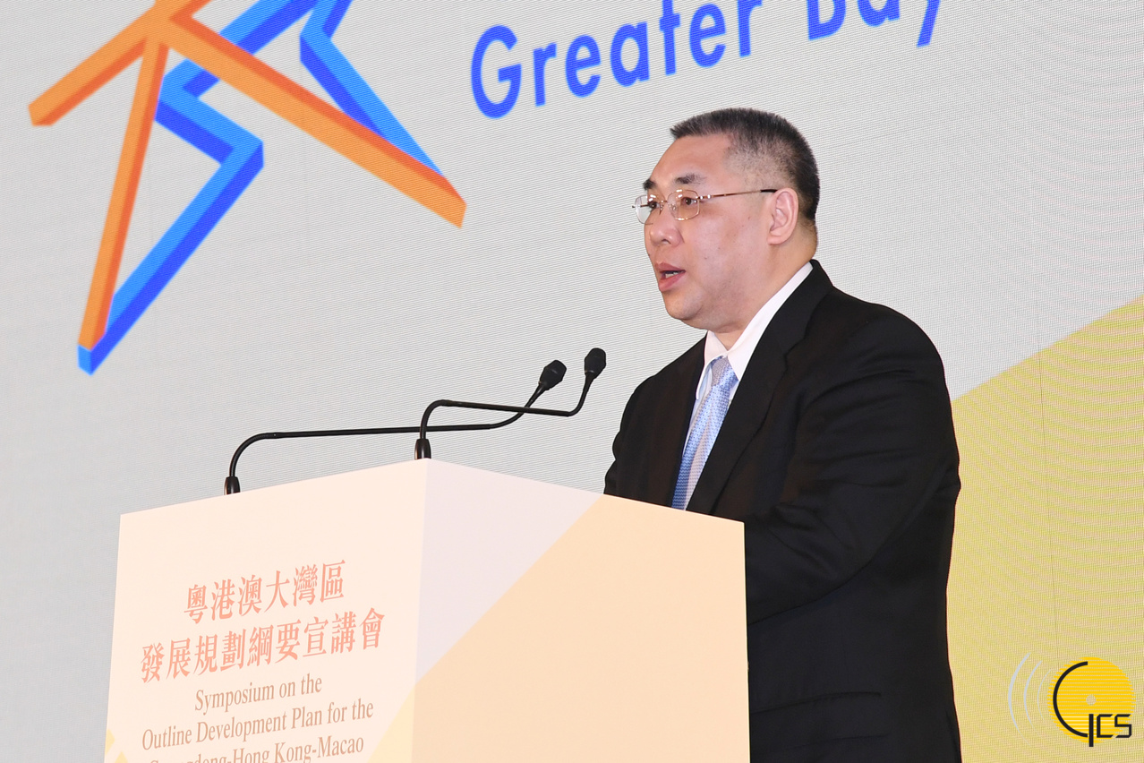 • Chefe do Executivo, Chui Sai On discursa na sessão de divulgação sobre as Linhas Gerais do Planeamento para o Desenvolvimento da Grande Baía Guangdong-Hong Kong-Macau.