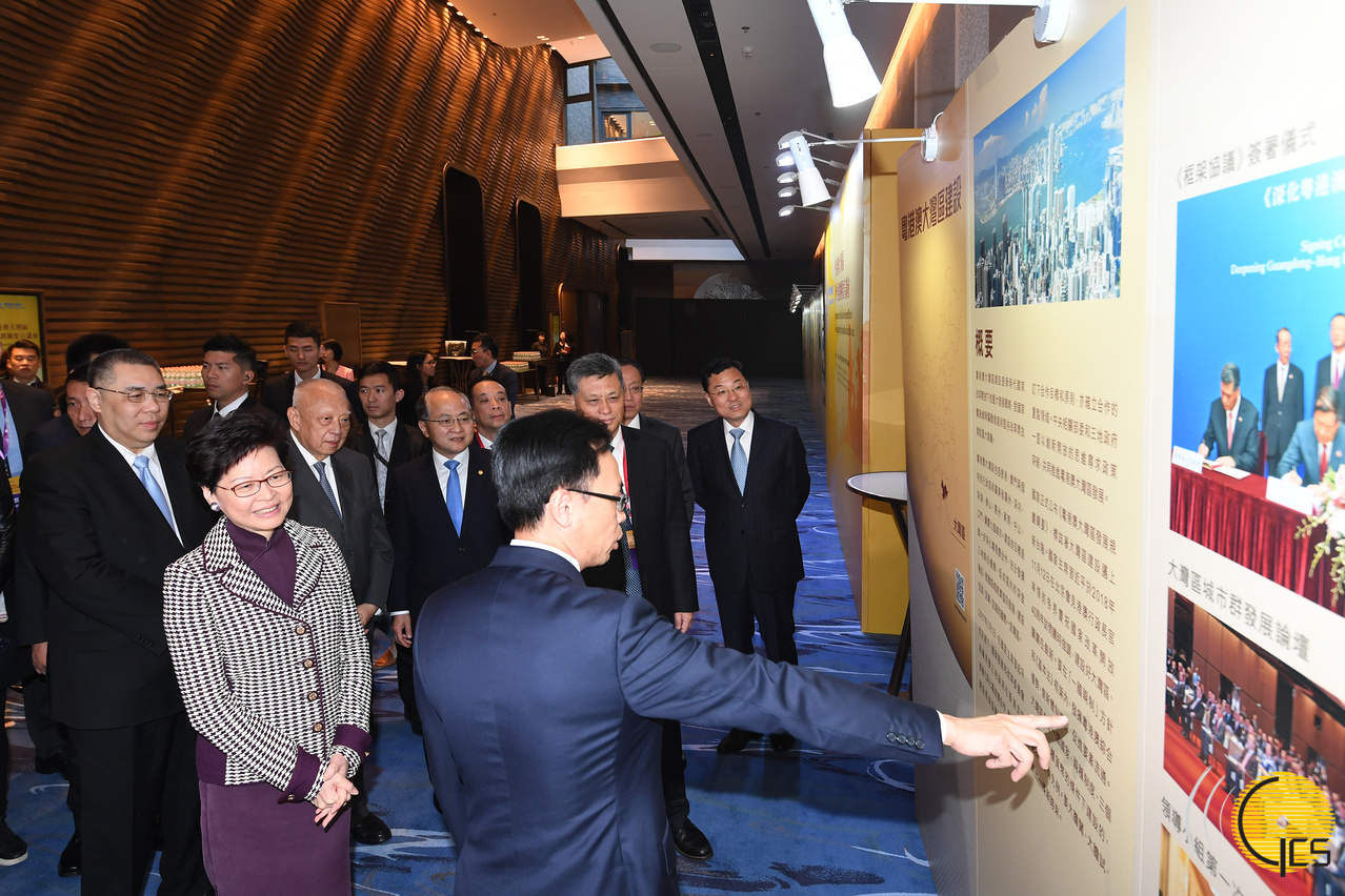 • Chefe do Executivo, Chui Sai On e os principais convidados visitam a exposição de fotografia antes da sessão de divulgação sobre as Linhas Gerais do Planeamento para o Desenvolvimento da Grande Baía Guangdong-Hong Kong-Macau.