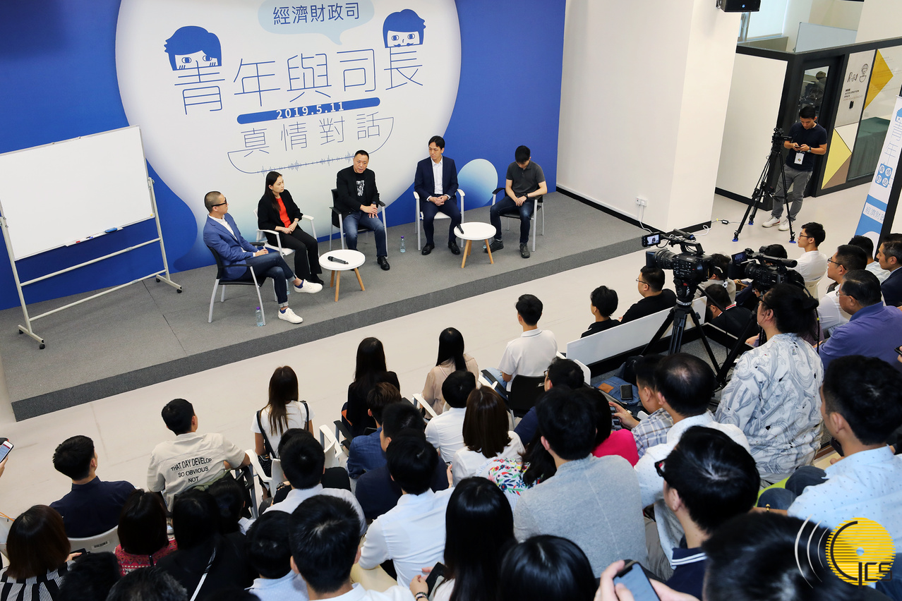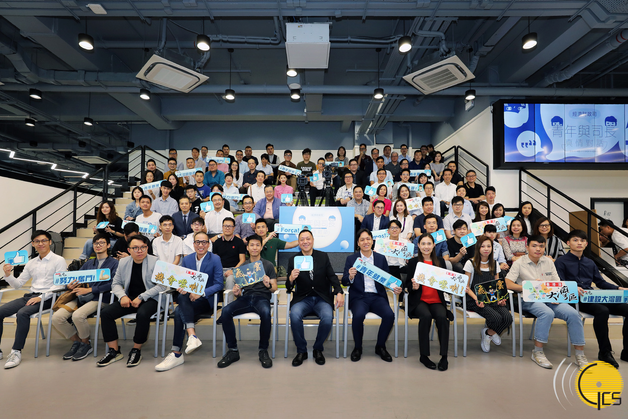 Secretário para a Economia e Finanças, Lionel Leong, em conversa animada com jovens num evento realizado no Centro de Incubação de Negócios para os Jovens de Macau.