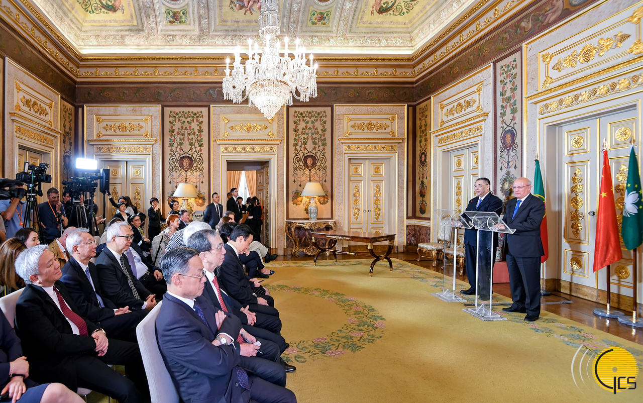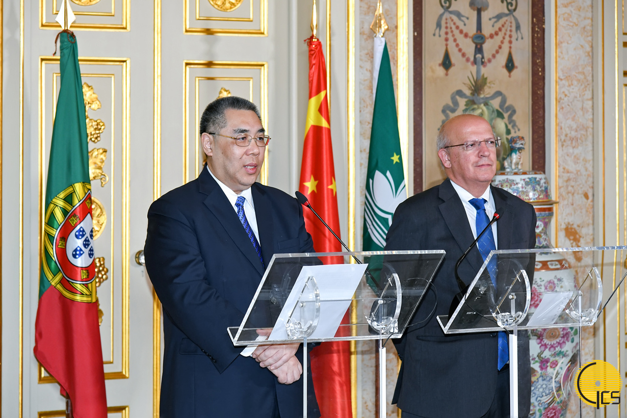 Chefe do Executivo do Governo da Região Administrativa Especial de Macau (RAEM), Chui Sai On, e ministro dos Negócios Estrangeiros de Portugal, Augusto Santos Silva, falam à comunicação social, no final da 6.ª reunião da Comissão Mista Macau-Portugal.