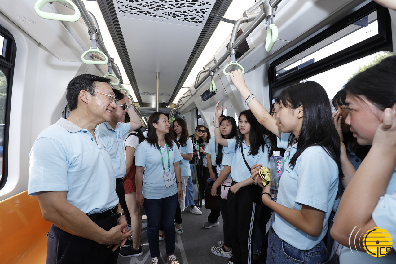 • Secretário para os Assuntos Sociais e Cultura, Alexis Tam, estudantes e jovens experimentam carruagem inteligente, ficando a conhecer a conveniência e facilidades dos transportes inteligentes.