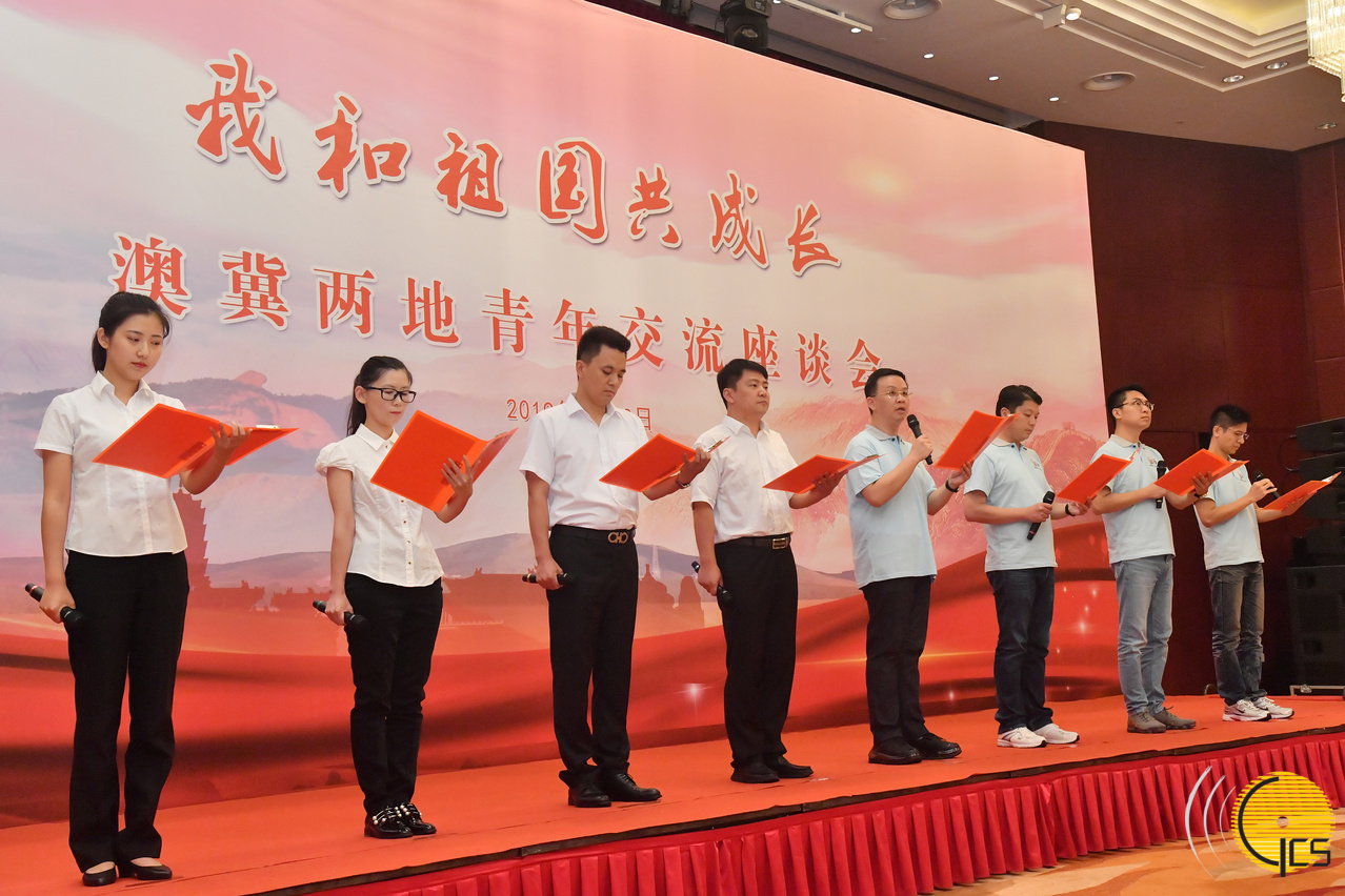 Chefe do Executivo, Chui Sai On, estudantes e jovens representantes da delegação de visita e aprendizagem «Caminhar juntos na Nova Era», presentes na sessão de intercâmbio, entre os jovens das duas regiões, subordinada ao tema "Estou a crescer com a Pátria", na cidade de Chengde, na província de Hebei.