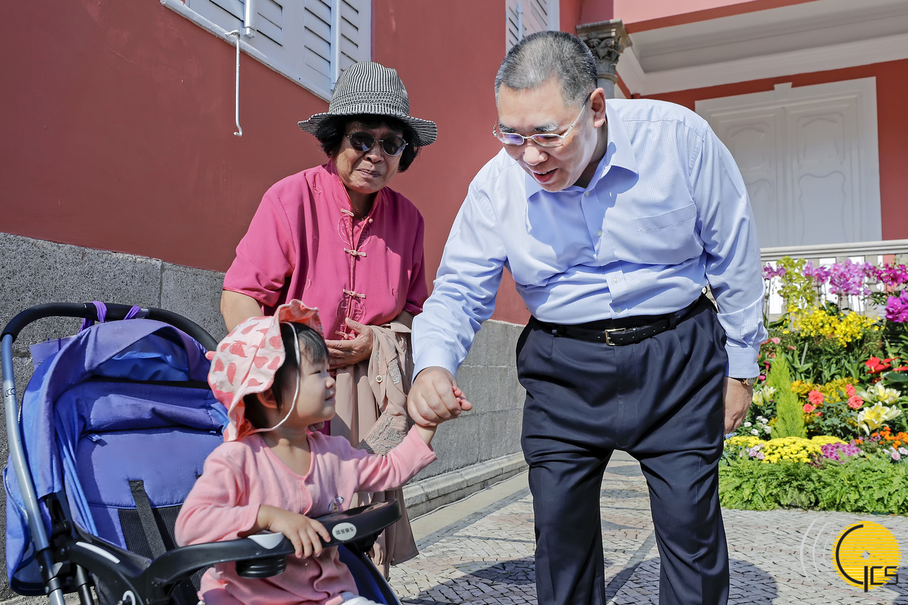 • Chefe do Executivo, Chui Sai On, conversa e tira uma fotografia com uma família que visita o Palácio Protocolar da Sede do Governo.