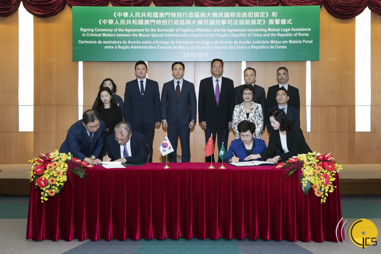 Cerimónia de assinatura do Acordo sobre a Entrega de Infractores em Fuga e do Acordo de Auxílio Judiciário Mútuo em Matéria Penal entre a Região Administrativa Especial de Macau da República Popular da China e a República da Coreia.