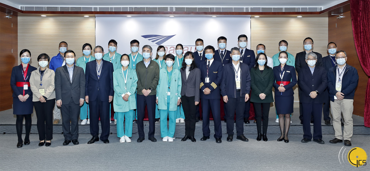 Secretário para a Administração e Justiça, André Cheong, secretária para os Assuntos Sociais e Cultura, Ao Ieong U, comandante-geral dos Serviços de Polícia Unitários, Leong Man Cheong, chefe do Gabinete do Chefe do Executivo, Hoi Lai Fong, presidente do Conselho de Administração da CAM — Sociedade do Aeroporto Internacional de Macau, Ma Iao Hang, presidente do Conselho de Administração Air Macau, Chen Hong, posam para uma fotografia de grupo ao lado dos funcionários das áreas da saúde e do turismo e dos elementos da tripulação que seguirão a bordo do avião para regresso de residentes de