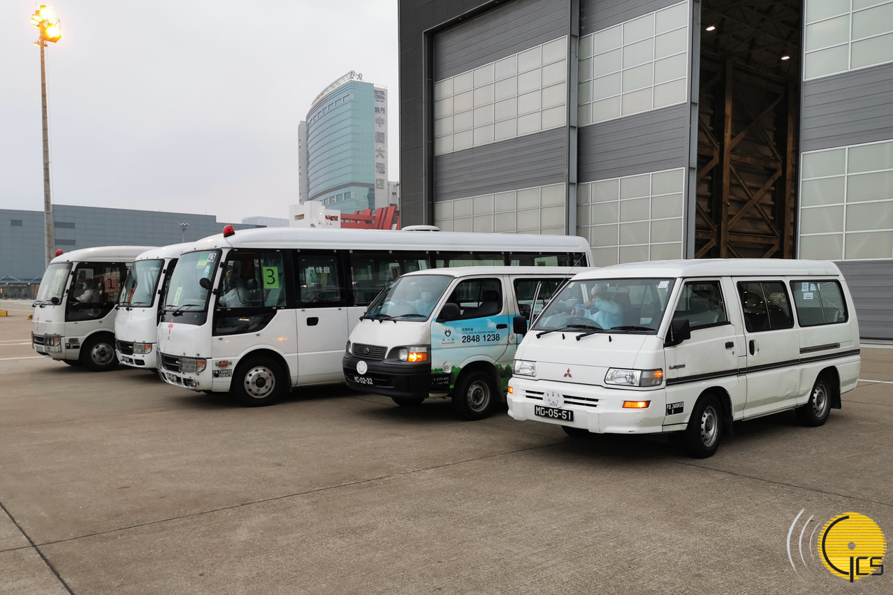 • Veículos já preparados no aeroporto para o transporte dos residentes que regressaram de Hubei.