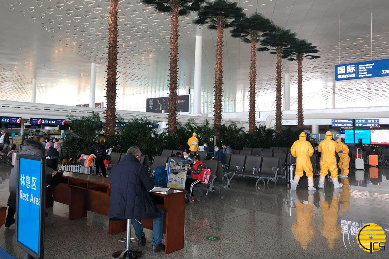 Residentes de Macau à espera do avião fretado pelo Governo da RAEM no Aeroporto Internacional de Tianhe, em Wuhan.