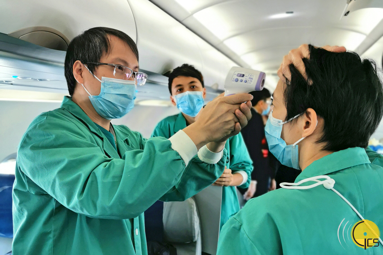 Todos os funcionários antes de chegar a Hubei, medem a sua temperatura corporal no avião.