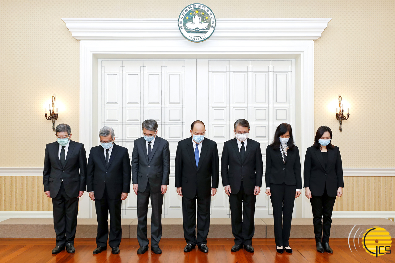 Chefe do Executivo, Ho Iat Seng, secretário para a Administração e Justiça, André Cheong, secretário para a Economia e Finanças, Lei Wai Nong, secretário para a Segurança, Wong Sio Chak, secretária para os Assuntos Sociais e Cultura, Elsie Ao Ieong, secretário para os Transportes e Obras Públicas, Raimundo do Rosário, e chefe do Gabinete do Chefe do Executivo, Hoi Lai Fong, na Sede do Governo, prestam tributo aos heróis que sacrificaram a vida na luta contra a epidemia da pneumonia causada pelo novo tipo de coronavírus e aos compatriotas falecidos.