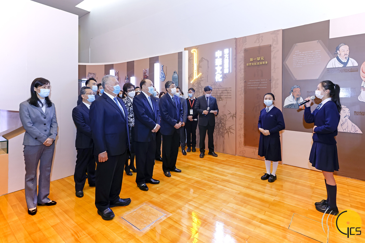 • Estudantes e jovens fazem uma apresentação da Base da Educação do Amor pela Pátria e por Macau para Jovens ao Chefe do Executivo, Ho Iat Seng, durante a visita à zona de exposições.