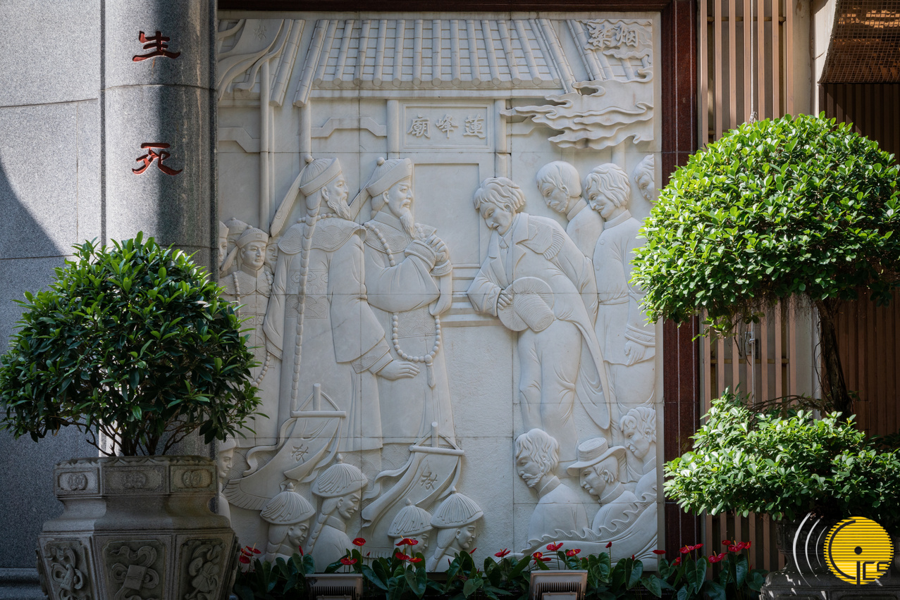 • Na praça do edifício do Hospital Kiang Wu, existe um painel em mármore branco com a imagem em grande relevo do jovem médico Sun Yat-sen e um conjunto de imagens sobre o desenvolvimento do Hospital Kiang Wu.