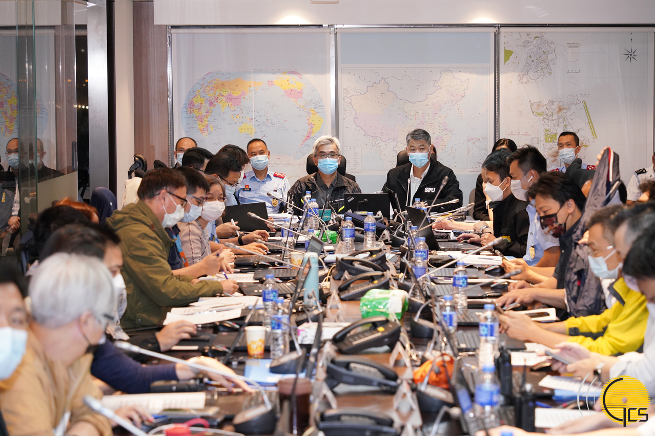 • Secretário para a Segurança, Wong Sio Chak, no Centro de Operações de Protecção Civil, onde ouve apresentação, por membros da estrutura, sobre o ponto de situação dos trabalhos do plano de contingência, aquando da passagem do tufão "Lionrock".