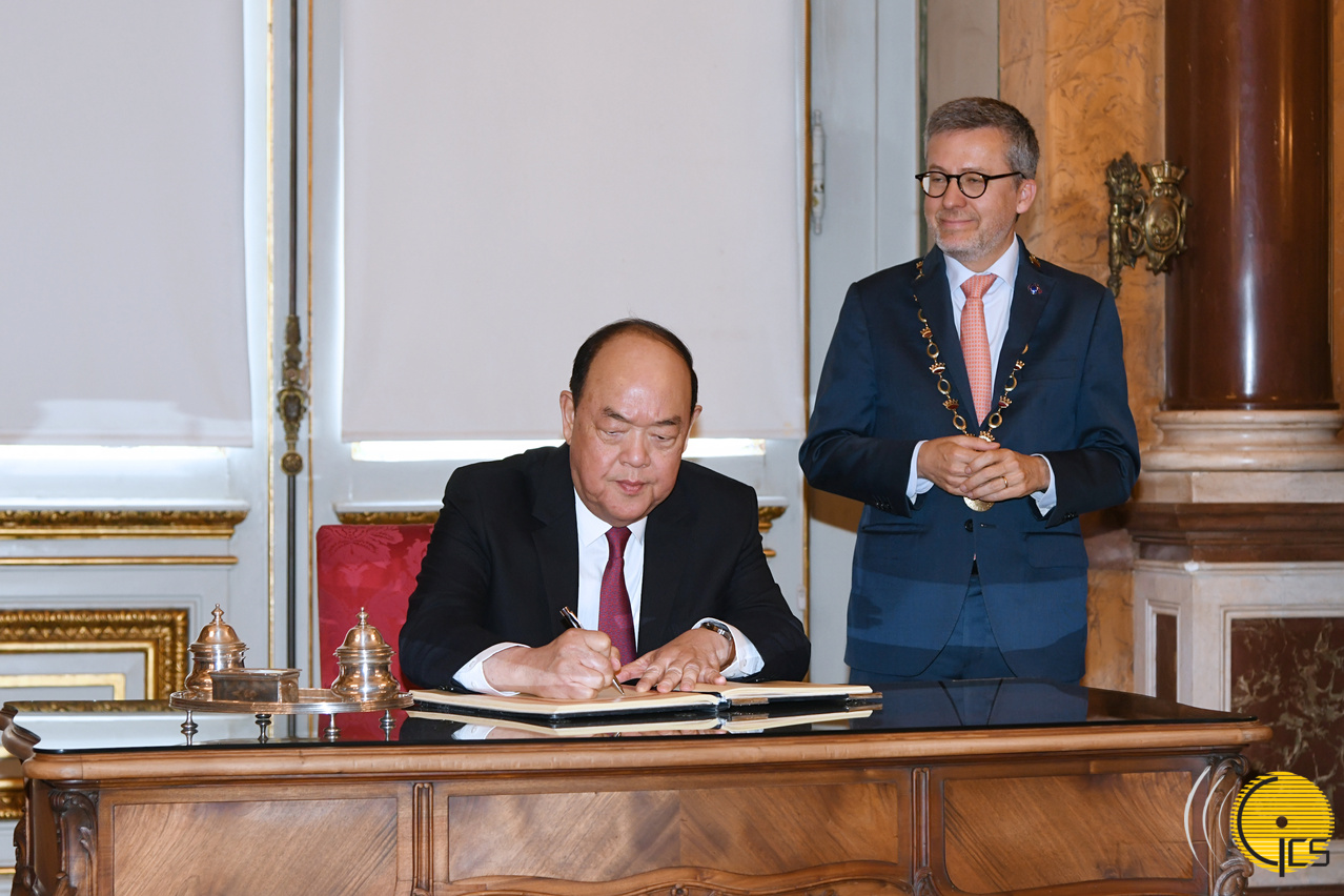 • Chefe do Executivo, Ho Iat Seng, assina o livro de honra, após o encontro com o presidente da Câmara Municipal de Lisboa, Carlos Moedas, no âmbito da visita a Portugal.