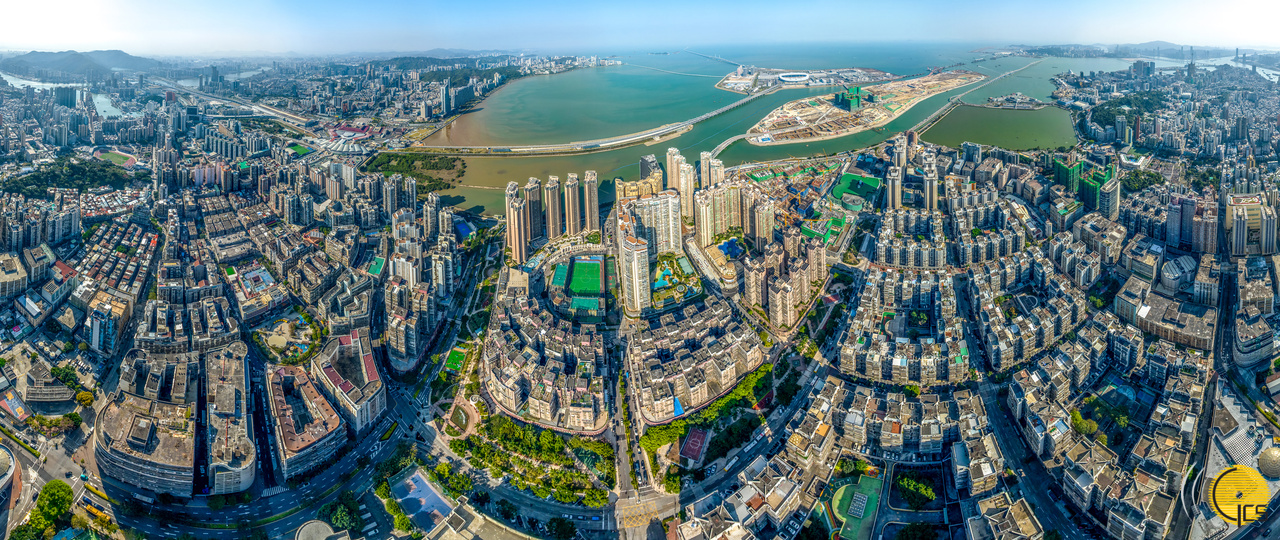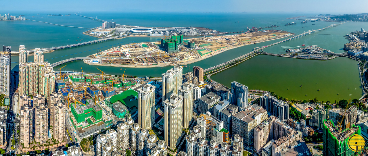 • A vista da Zona A dos Novos Aterros, a Ponte Hong Kong – Zhuhai – Macau e a Zona de Administração de Macau na Ilha Fronteiriça Artificial.