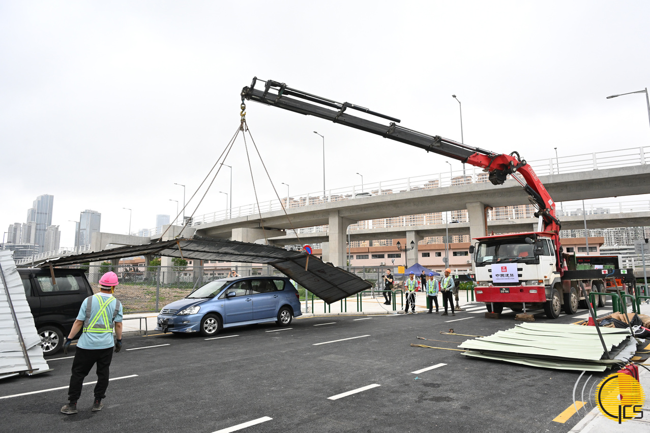 • Simulacro de tufão “Peixe Cristal 2024”--veículo danificado pela queda de uma grande barraca de zinco, o Corpo de Polícia de Segurança Pública coordena o uso de máquinas e pessoal da construtora para remover a barraca de zinco, depois de cortada em pedaços.