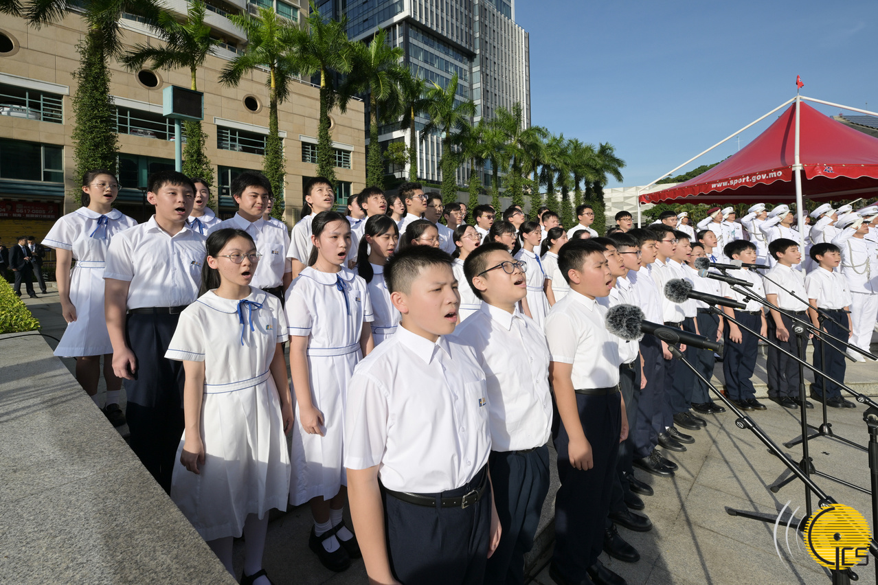 • Cerca de cem alunos do ensino secundário cantam o hino nacional na cerimónia do içar da bandeira,no âmbito das comemorações do 75.º aniversário da implantação da República Popular da China.