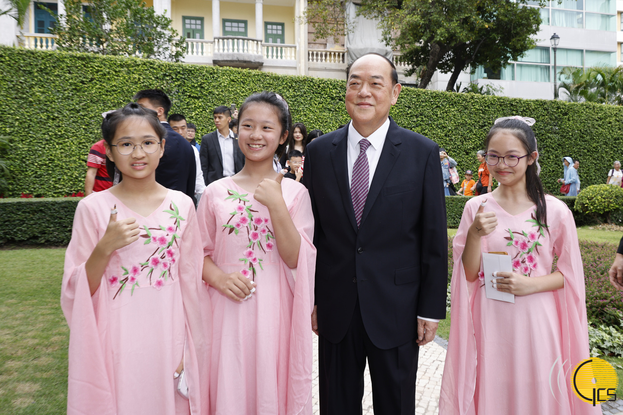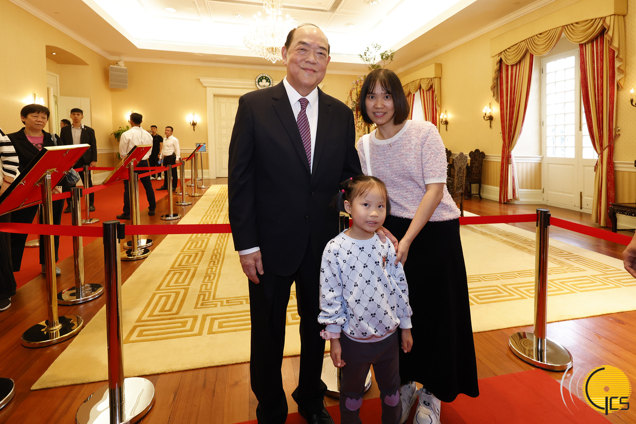 • Chefe do Executivo, Ho Iat Seng, tira fotografias com uma família que visita a Sede do Governo e partilha a atmosfera de alegria do dia de abertura.