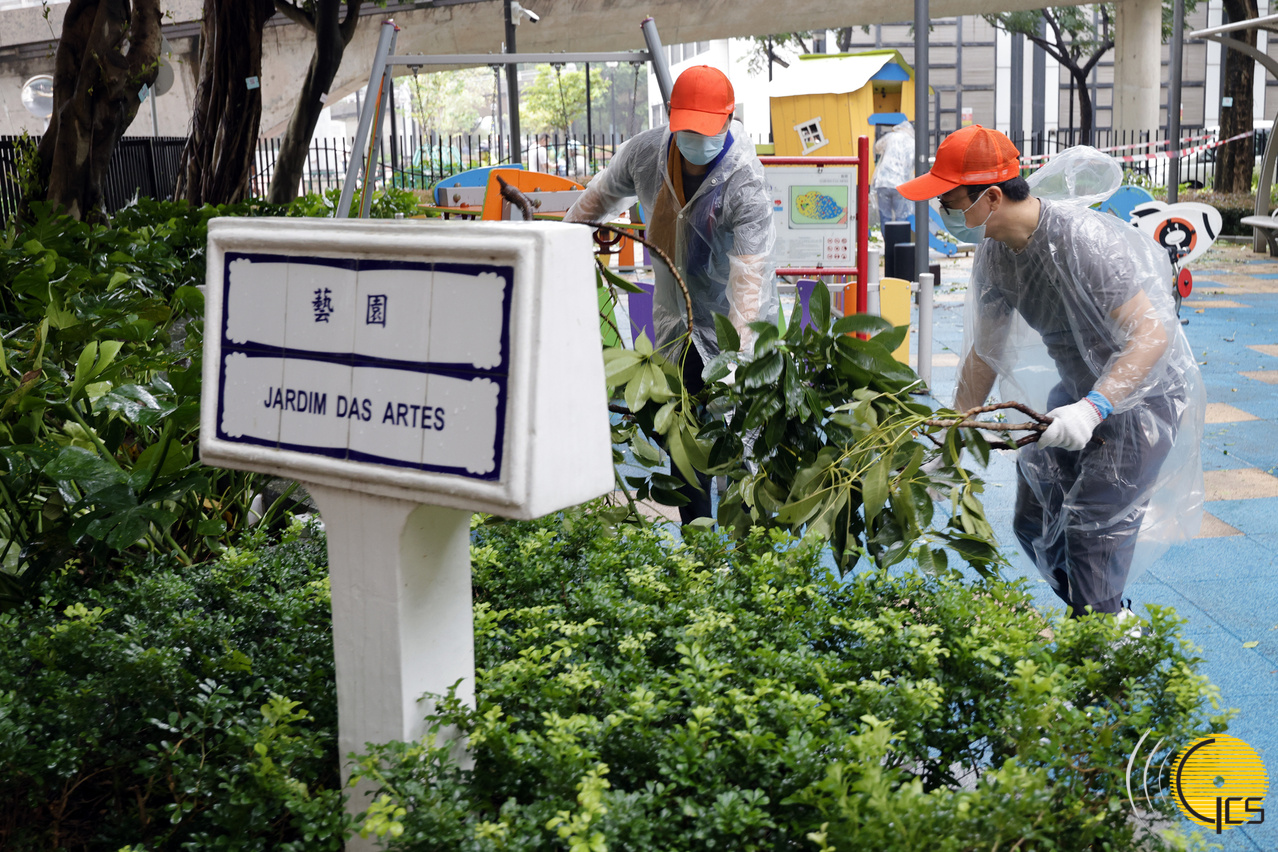 • Equipas de apoio pós-tempestade dos serviços públicos participam em acções de limpeza dos arruamentos em diferentes zonas da cidade após a passagem do tufão.