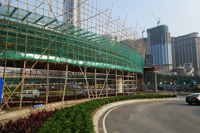 “O bambu é um terço mais barato do que o ferro, é bastante mais versátil, os andaimes metálicos são feitos a direito não há a possibilidade de dobrar. O bambu é muito fácil de se deformar e de acompanhar as curvas do edifício”, explica João Ó, em português, enquanto Chio Seng Wai prossegue em cantonês.