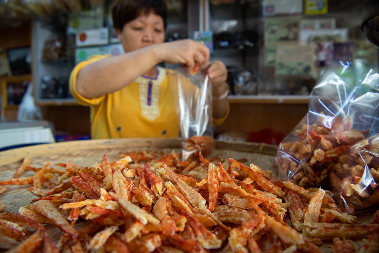 Neste momento, a Ieng Lei vende uma variedade de produtos secos importados de vários países, como a Indonésia e o Brasil. Alguns destes produtos são parcialmente processados e secos ao sol na palafita que Cheong gere com a sua equipa. “Às vezes, a pedido de amigos e velhos clientes, compramos peixe fresco a vendedores locais para o salgar, mas é caro fazer isso hoje em dia”, diz. “Com um cate de peixe fresco não se consegue nem sequer meio cate de peixe salgado.”