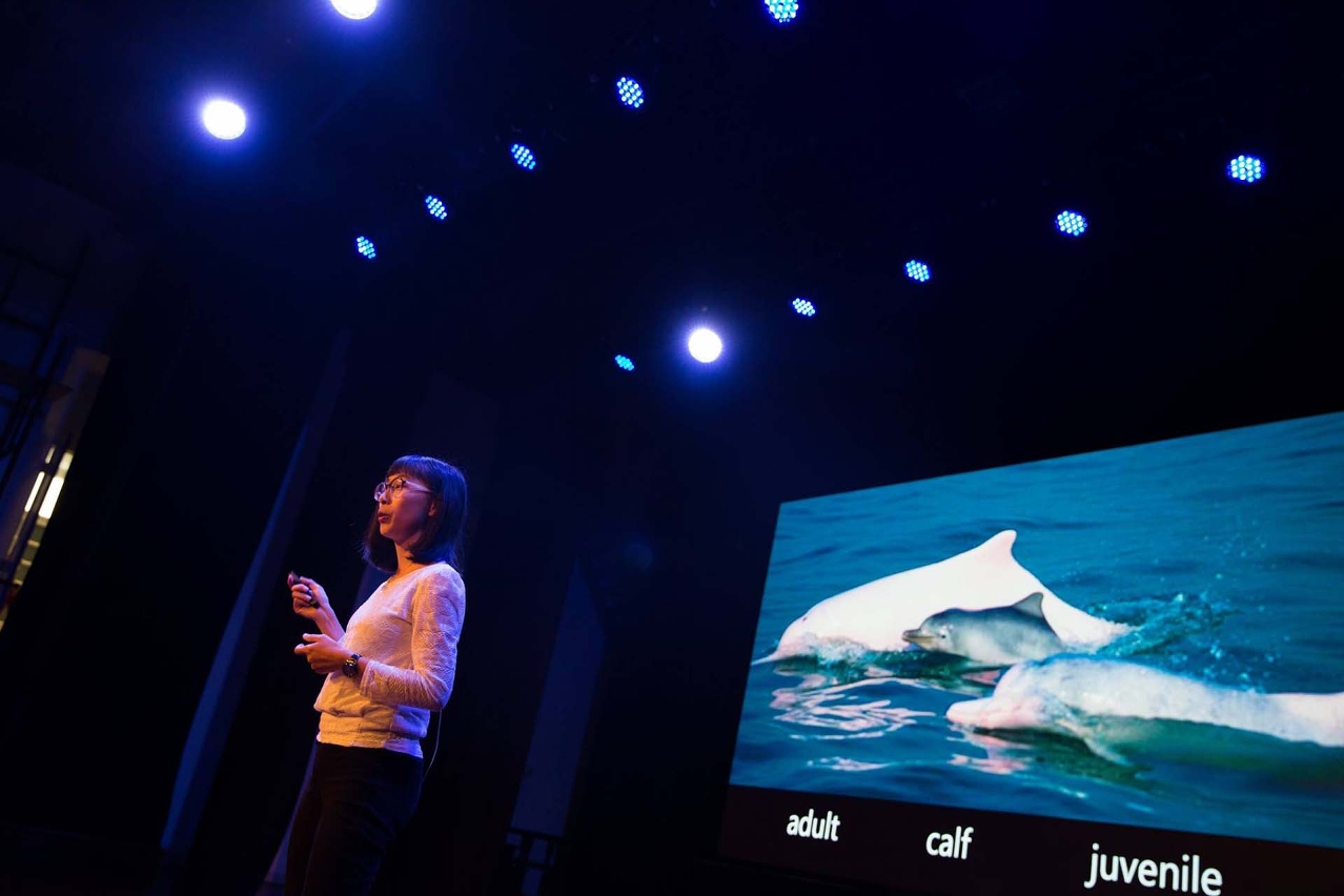 A activista ambiental Viena Mak fez uma apresentação sobre golfinhos durante a edição de 2019 do TEDxSenadoSquare (Foto: Direitos Reservados)