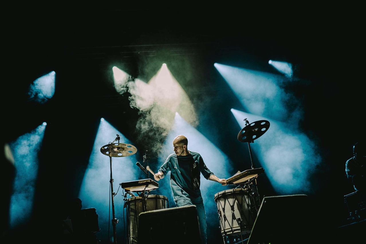 É de pé, envolvido por bombos tradicionais portugueses – feitos por si –, e dividindo-se entre microfone e percussão, que João Caetano se apresenta em palco a solo. “Sou o único artista no mundo que toca bombos tradicionais portugueses, canta e é intérprete”, diz.