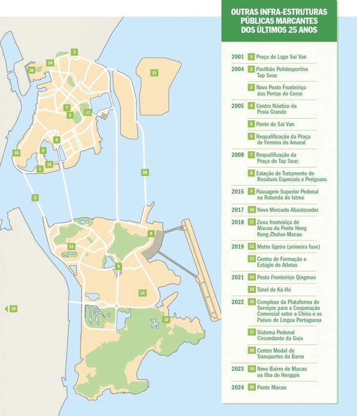 De mais habitação pública a melhores transportes, passando por novas áreas de expansão, através de aterros. Ao longo dos últimos 25 anos, foram várias as grandes obras públicas que marcaram o desenvolvimento de Macau. Estes projectos não mudaram apenas a imagem da cidade, mas tiveram um forte impacto na qualidade de vida da população e na economia