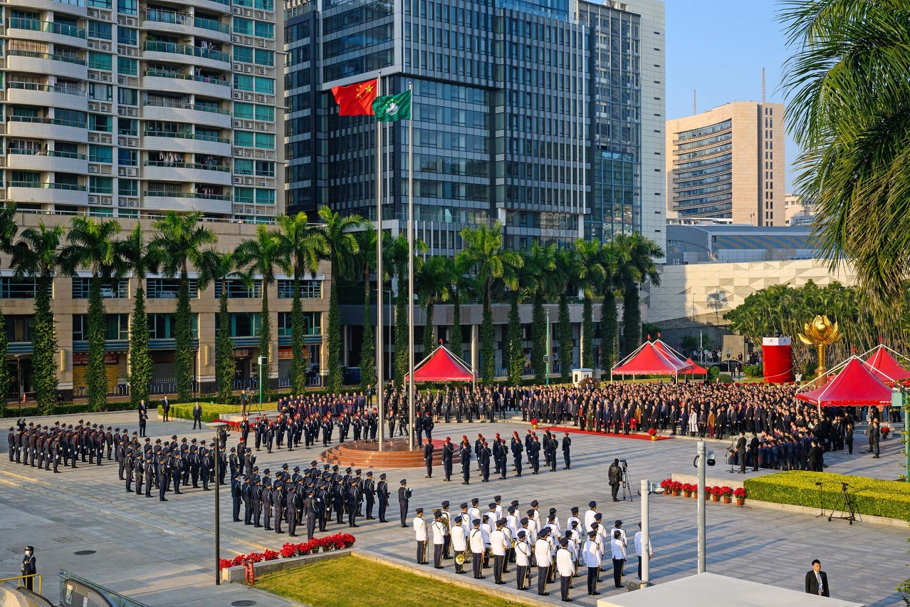 A cerimónia do hastear da bandeira para celebrar o 25.º aniversário da RAEM decorreu na Praça Flor de Lótus