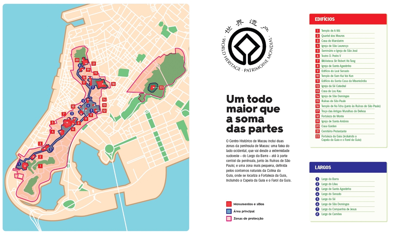 A bom ritmo, é um percurso que se faz num par de horas a pé, mas que demorou cinco séculos a construir. O Centro Histórico de Macau, ligando o Largo da Barra às Ruínas de São Paulo, a que se soma a Fortaleza da Guia, está a comemorar 20 anos da sua inclusão na Lista do Património Mundial da UNESCO, acrónimo pelo qual é comummente conhecida a Organização das Nações Unidas para a Educação, a Ciência e a Cultura.