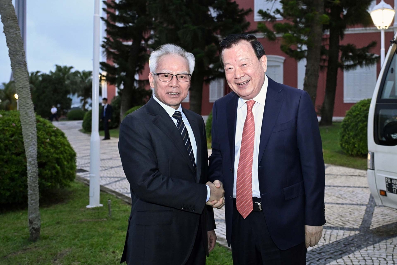 Xia Baolong (dir.) deslocou-se a Macau entre 8 e 13 de Maio, tendo sido recebido pelo Chefe do Executivo, Sam Hou Fai (esq.), logo no primeiro dia da estadia na RAEM (Foto: GCS)