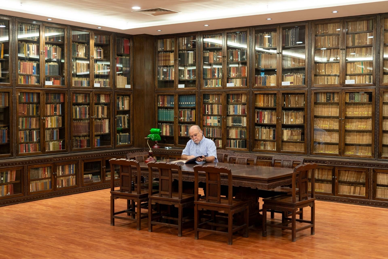 Rui Martins fotografado junto da colecção de livros raros da Biblioteca da Universidade de Macau (Foto: Oswald Vas)