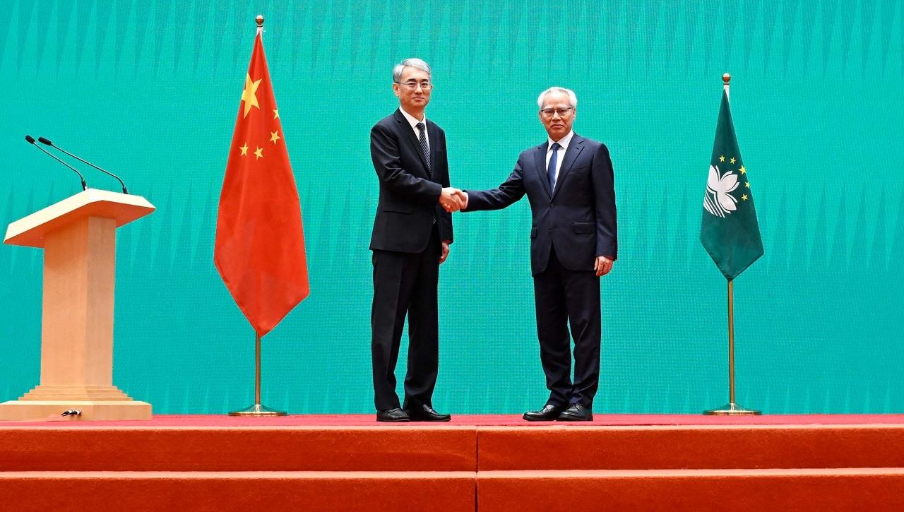 O Chefe do Executivo, Sam Hou Fai (dir.), cumprimenta o novo presidente da Assembleia Legislativa, Cheong Weng Chon (esq.) (Foto: Gabinete de Comunicação Social)