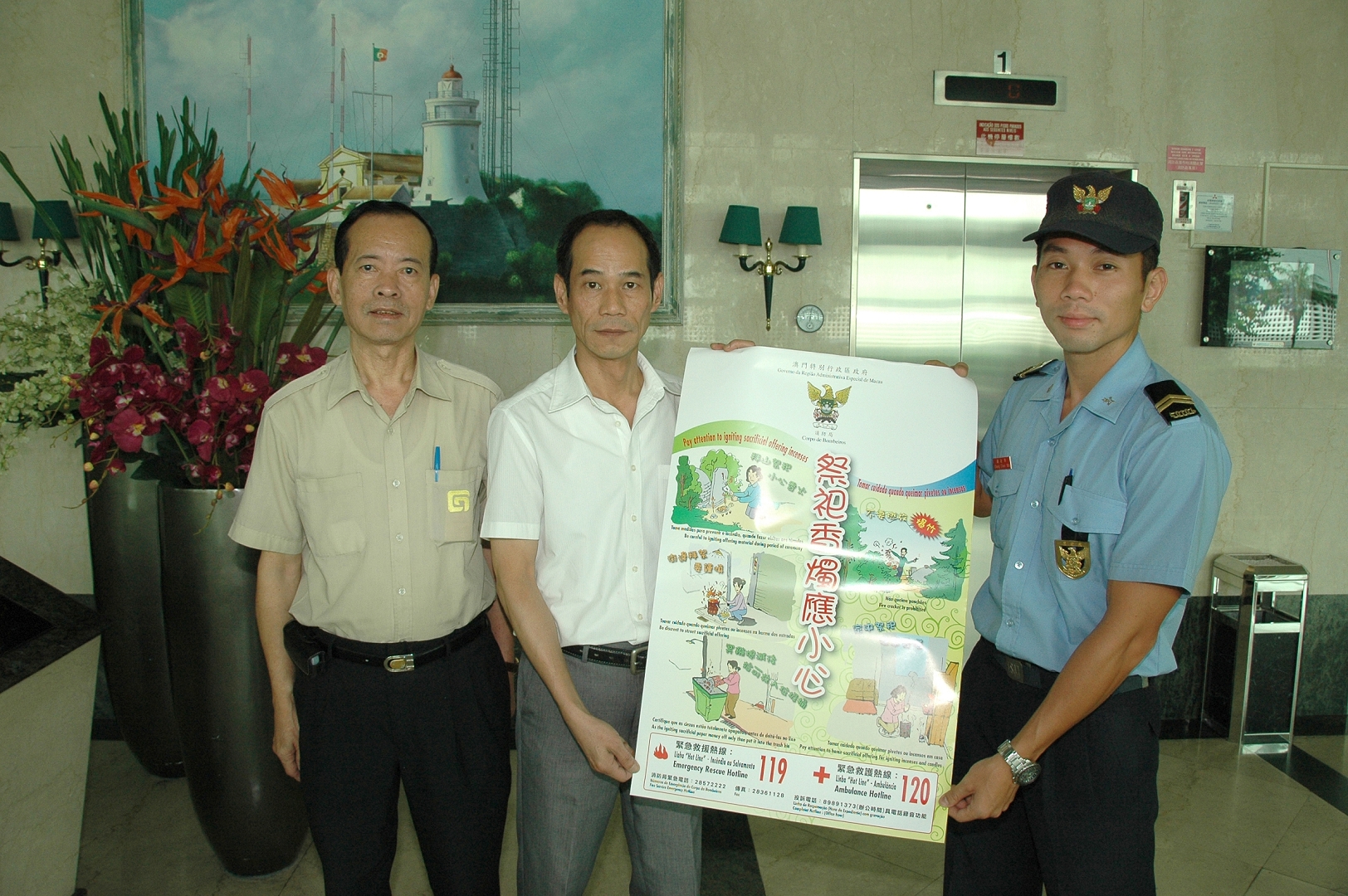 Conforme a tradição popular chinesa, os cidadãos festejam o Dia do Bolo Lunar ( Chong Chao ), observando a beleza da lua e para tal transportando lanternas, por isso, nos dias 16, 17, 20 e 21 de Setembro do ano corrente, o Corpo de Bombeiros, com o uso da viatura de divulgação sobre prevenção de incêndios, promoveu a distribuição de panfletos e cartazes, na Zona Norte e na Taipa, no sentido de reforçar a consciência da população no âmbito de segurança e respectivos conhecimentos sobre prevenção, através desta campanha de sensibilização.