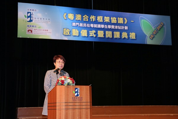 O subsídio de propinas para residentes de Macau que frequentam estabelecimentos de ensino na província de Guangdong foi criado no âmbito do “Acordo-Quadro de Cooperação Guangdong-Macau”, tendo por objectivo promover a igualdade no acesso ao ensino, fornecendo aos jovens de Macau boas condições de aprendizagem. Este subsídio foi concedido, pela primeira vez, no ano lectivo de 2012/2013 sob a forma de projecto-piloto, aos alunos de Macau que frequentam o ensino secundário complementar nas escolas regulares ou nas escolas intermédias profissionais, ambos a tempo inteiro, das cidades de Zhuhai e Zhongshan, tendo sido beneficiados cerca de 260 alunos, sendo o montante do subsídio calculado de acordo com o montante de propinas a pagar pelo aluno, com um valor máximo, por aluno e por ano lectivo, de MOP4.000.