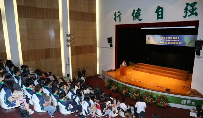 A Cerimónia de lançamento do programa de subsídio de propinas para residentes de Macau que frequentam estabelecimentos de ensino na província de Guangdong e Cerimónia de abertura das aulas, organizadas pela Direcção dos Serviços de Educação e Juventude (DSEJ), em colaboração com a Associação dos Embaixadores do Património de Macau, teve lugar no auditório da Escola Luso-Chinesa Técnico-Profissional, no dia 16 de Julho. Os convidados participantes neste evento incluíram a subchefe do Gabinete de Ligação do Governo Popular Central na Região Administrativa Especial de Macau, Dra. Xu Ting, a directora dos Serviços de Educação e Juventude, Dra. Leong Lai, o assessor do Gabinete do Secretário para os Assuntos Sociais e Cultura, Dr. Wai Cheng Iong e a vice-presidente da Associação dos Embaixadores do Património de Macau, Sra. Ng Chi Man, entre outros.
