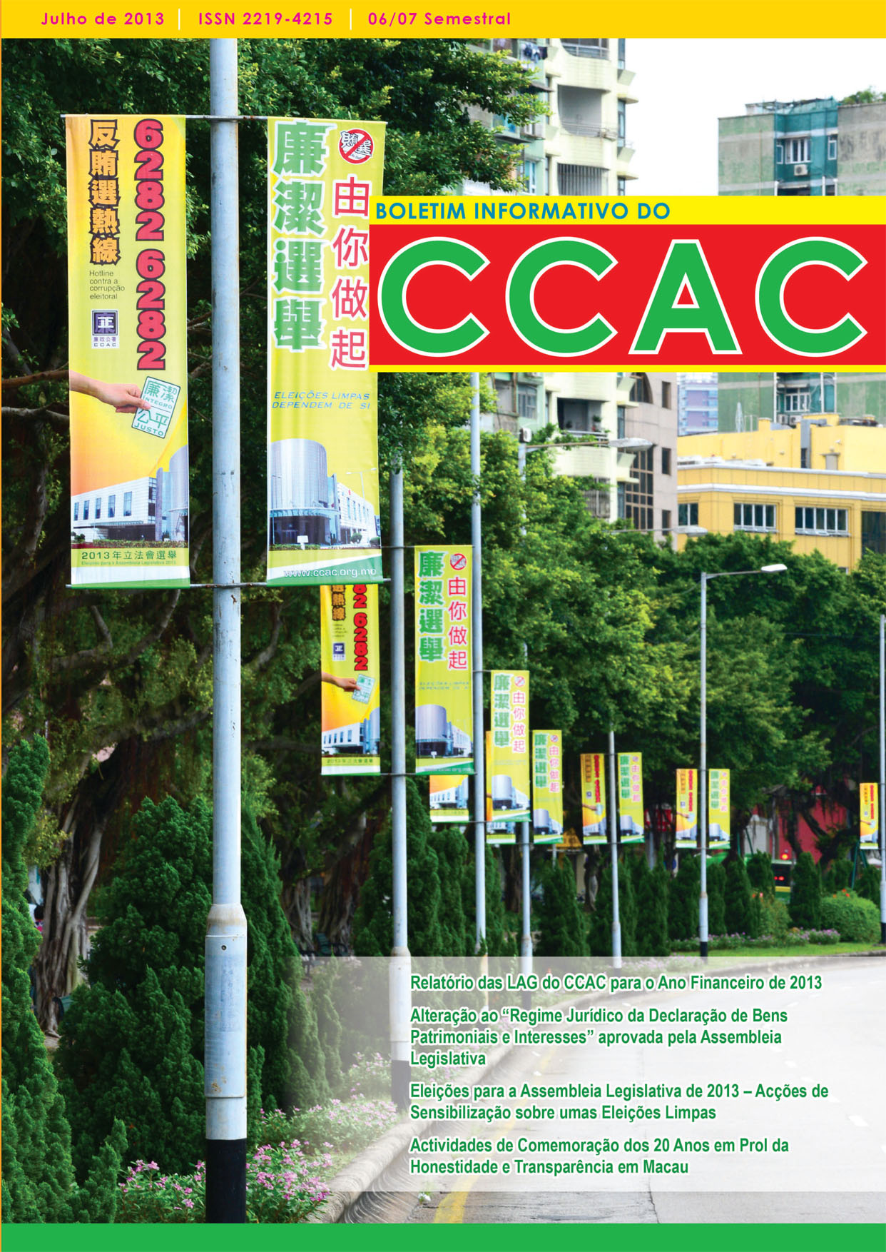 Nesta edição do Boletim Informativo do CCAC, há uma parte destinada a umas eleições limpas para a Assembleia Legislativa, fazendo uma apresentação geral dos trabalhos desenvolvidos pelo CCAC no âmbito de sensibilização e divulgação. Ademais, para que a população, os agentes eleitorais e os candidatos possam conhecer melhor os problemas que frequentemente assolam as eleições para a Assembleia Legislativa, inclui-se, em forma de perguntas e respostas, e após uma cuidada análise e compilação, alguns dos problemas mais comuns e relevantes anteriormente registados, na parte intitulada “Colectânea de Perguntas e Respostas sobre as Eleições para a Assembleia Legislativa de 2013”.