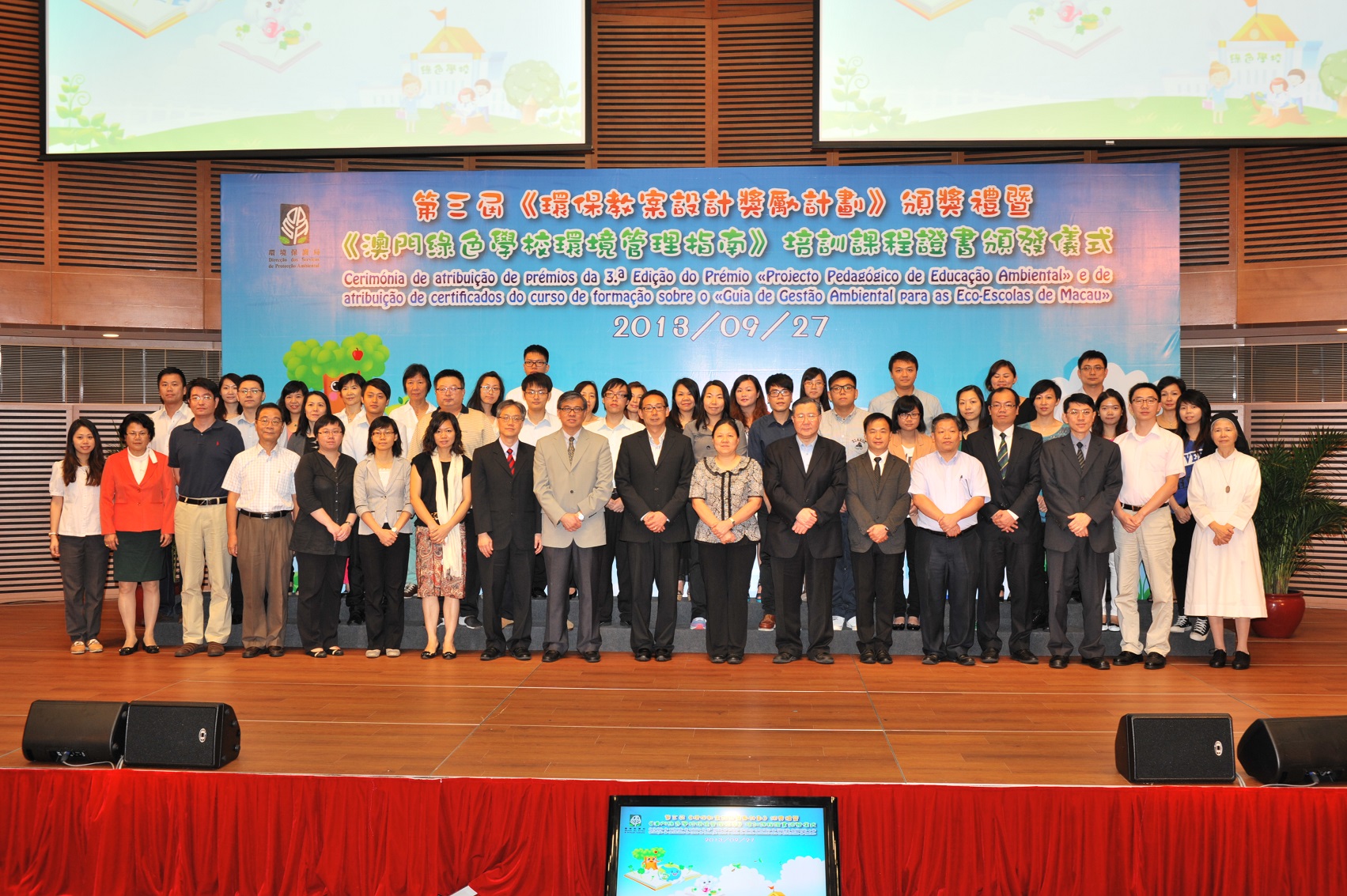 Hoje (27 de Setembro) foi realizada a cerimónia de atribuição de prémios da 3.ª Edição do Prémio «Projecto Pedagógico de Educação Ambiental» e de atribuição de certificados do curso de formação sobre o «Guia de Gestão Ambiental para as Eco-Escolas de Macau». O evento é, além do reconhecimento da criatividade, o reconhecimento pela paixão e dedicação do pessoal docente da educação ambiental e dos estudantes do ensino superior e, ao mesmo tempo, pela participação nas actividades do «Guia de Gestão Ambiental para as Eco-Escolas de Macau», atribuindo certificados do curso de formação às escolas e aos professores participantes, para promover nas escolas de Macau a prática na gestão e educação ambiental, assim como para promover o desenvolvimento sustentável das “Eco-Escolas”.