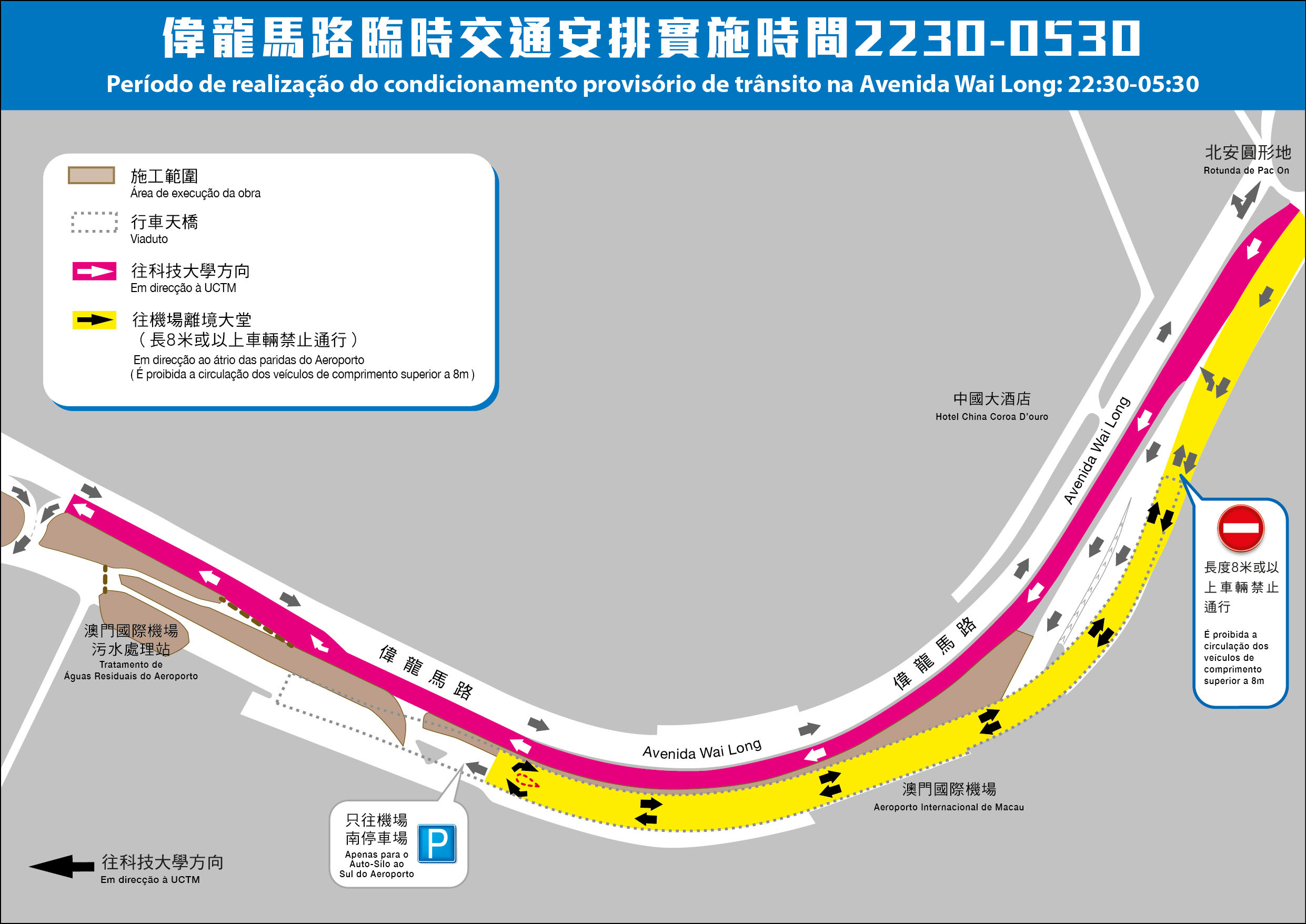 Devido à execução da elevação e montagem do Metro Ligeiro na Av. Wai Long, será encerrado temporariamente o troço rodoviário em frente à Estação de Tratamento de Águas Residuais do Aeroporto a partir de sábado (dia 3) à noite para realização da betonagem dos dois suportes do viaduto, o que permite, deste modo, o avanço contínuo da máquina de instalação das peças pré-fabricadas. Durante as horas de execução das obras, que são das 22H30 às 5H30, o viaduto em frente ao Aeroporto Internacional de Macau permitirá apenas a circulação dos veículos ligeiros em direcção ao átrio das partidas do Aeroporto ou ao parque de estacionamento situado a sul do mesmo, e os veículos de comprimento superior a 8 metros e os que circularem da Rotunda de Pac On para a UCTM, por sua vez, terão de passar pelo túnel subterrâneo da Av. Wai Long. Ao mesmo tempo, serão disponíveis no local o comando dos agentes de trânsito e as sinalizações de trânsito, assim, o GIT e a DSAT chamam atenção do público para essas medidas.