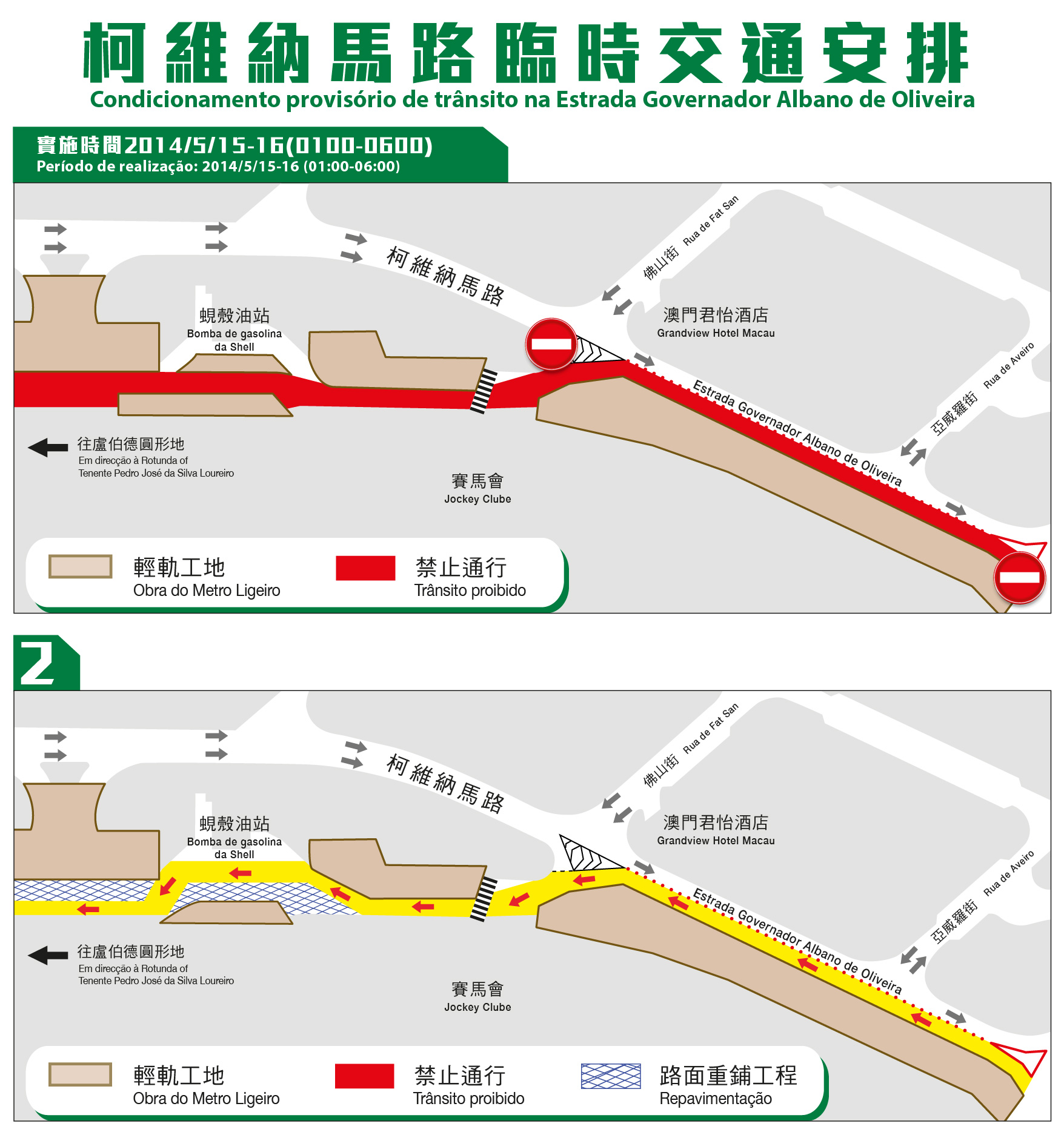 Após a coordenação, o empreiteiro desenvolverá, a partir de hoje, a repavimentação por fases dum troço da linha oeste da Estrada Governador Albano de Oliveira. A 1.ª fase, que será efectuada a partir de hoje e durante a madrugada dos dois dias seguidos, entre a 01H00 e as 06H00, consiste na repavimentação da via asfaltada com cerca de 80 metros de comprimento, em frente da bomba de gasolina da Shell. Naquela altura em que um troço da Estrada Governador Albano de Oliveira, compreendido entre a Rotunda do Estádio e a Rotunda Tenente Pedro José da Silva Loureiro, ficará temporariamente encerrado, proibindo a circulação de veículos. Assim, os veículos terão de passar pela Avenida do Estádio e pela Avenida dos Jogos da Ásia Oriental para chegar à Ponte de Sai Van.