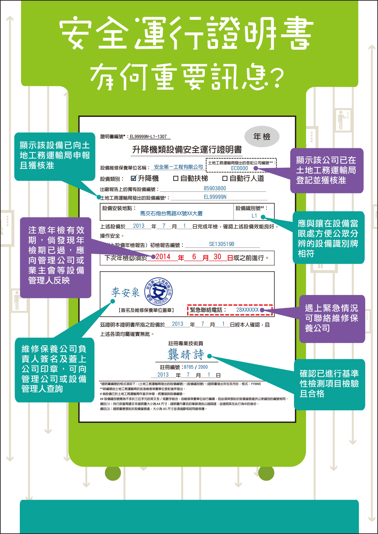 De acordo com as Instruções, os equipamentos electromecânicos cujo o prazo de inspecção tenha expirado a partir de 19 de Junho do ano passado devem ser objecto de nova inspecção conforme a lista padronizada dos aspectos de segurança, com o prazo de validade de inspecção de 1 ano e o certificado de segurança de funcionamento deve ser afixado em local visível no equipamento electromecânico. Por outras palavras, a partir de 19 de Junho do corrente ano, todos os equipamentos electromecânicos devem dispor de certificado de segurança de funcionamento. Os cidadãos devem estar atentos se foi ou não afixado o respectivo certificado nos elevadores existentes no edifício onde residem, bem como verificar se no certificado está indicado a designação da entidade responsável pela reparação e manutenção do elevador, a data em que foi realizada a última inspecção, a assinatura do responsável da entidade que procedeu à reparação e manutenção do elevador e o carimbo da empresa, designação do técnico inscrito na DSSOPT que foi responsável pela fiscalização da reparação e manutenção do elevador, e ainda em particular averiguar se no certificado consta o número do registo da empresa atribuído pela DSSOPT e o número do equipamento electromecânico, uma vez que, caso contrário, significa que nem a empresa, nem o equipamento electromecânico cuja reparação e manutenção é da sua responsabilidade estão registados na DSSOPT, encontrando-se assim fora do âmbito da inspecção periódica definida pela DSSOPT, podendo-se ainda não excluir a hipótese que esta empresa não procedeu à respectiva reparação e manutenção conforme estas Instruções, colocando assim em causa a segurança dos utentes.
