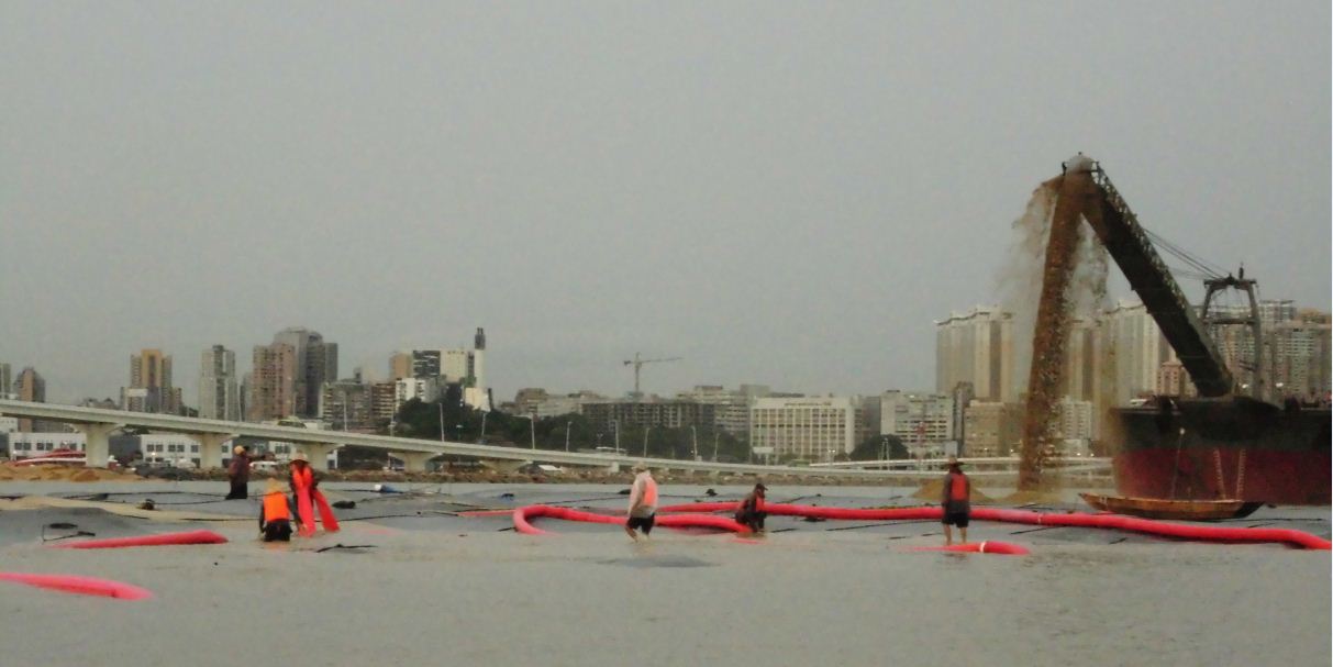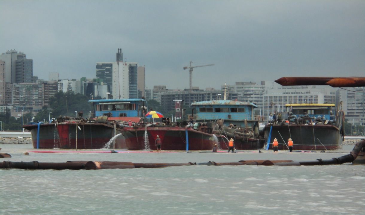 No momento, estão em iniciação simultânea 6 parcelas principais dos trabalhos na execução de aterro, nomeadamente: dragagem dos diques, construção dos diques, aterros para formação das zonas terrestres, construção do dique de separação, produção dos blocos especiais de betão (Tetrápodes) dos diques e de caissons, bem como a execução da deslocação e instalação do emissário para águas tratadas da E.T.A.R. da Península de Macau. O andamento em geral da empreitada tem sido elevado de uma forma comparativamente mais óbvia.