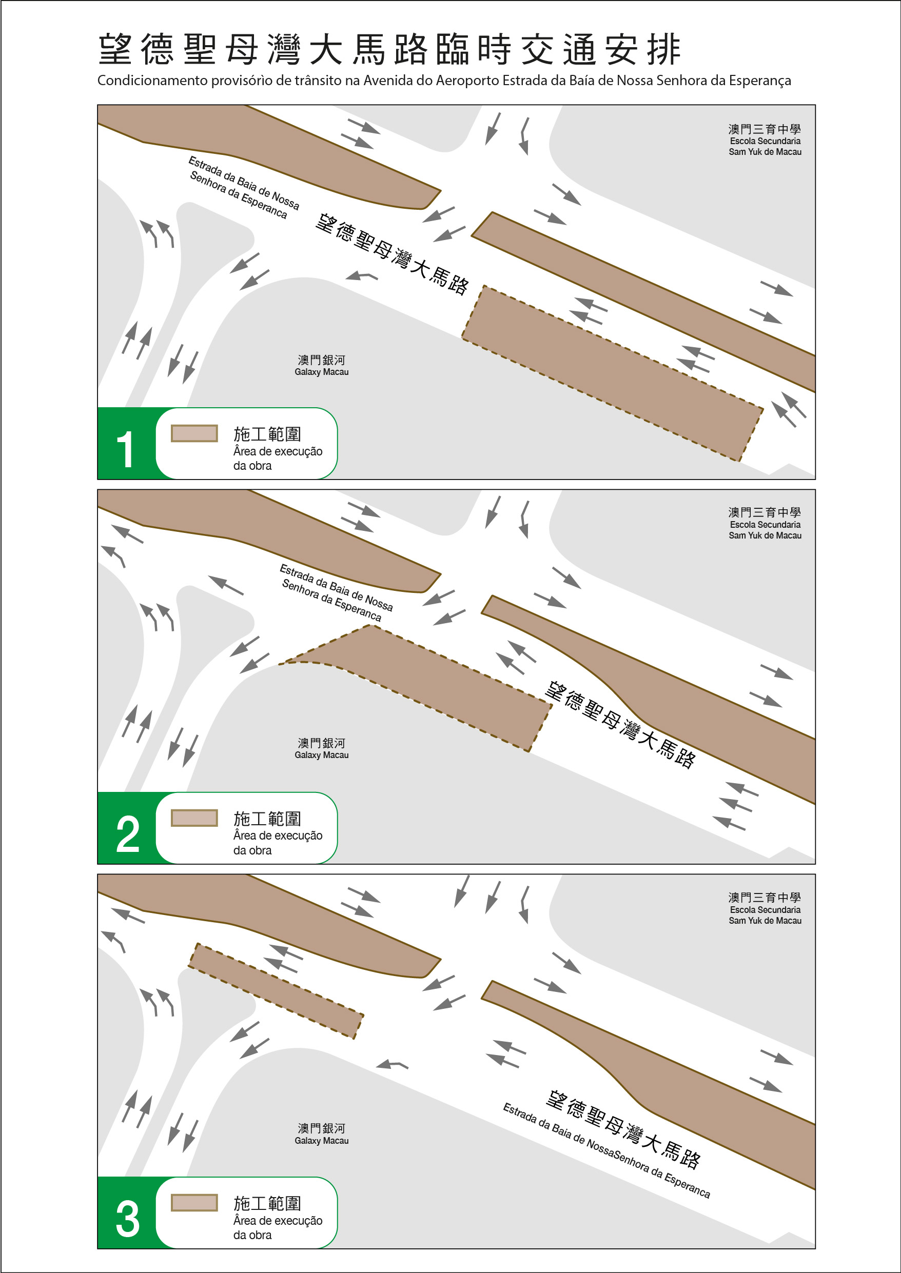 Devido ao trabalho de construção do Metro Ligeiro, no dia 12 do corrente mês (quinta-feira), o GIT desenvolverá, por três fases, o trabalho de melhoria de drenagem na Estrada da Baía de Nossa Senhora da Esperança da Taipa. Naquele período em que será condicionada a circulação na mesma estrada, junto da Galaxy Resort, isto é, a circulação em três vias passará a ser em duas (vide em anexo). Considerando que a estrada em questão é uma via principal para deslocação entre o Cotai e a Vila da Taipa, o empreiteiro foi pedido pelo GIT para disponibilizar uma parte da área de vedação para servir da faixa de rodagem temporária, de modo a manter a circulação em duas vias no troço da Rua do Colégio em direcção à Ponte Sai Van. Para tal, o prazo de execução é de cerca de 60 dias. Durante a 1.ª fase de execução, a paragem de autocarros “Rotunda da Piscina Olímpica” será temporariamente encerrada, pelo que os passageiros que apanham as carreiras n.os 25 (para Macau), 25X, 26A (para Macau), 35, MT1, MT2, MT3 e MT4 podem deslocar-se à paragem “Estrada da Baía da Nossa Senhora da Esperança/Galaxy” para efeitos de tomada e largada.