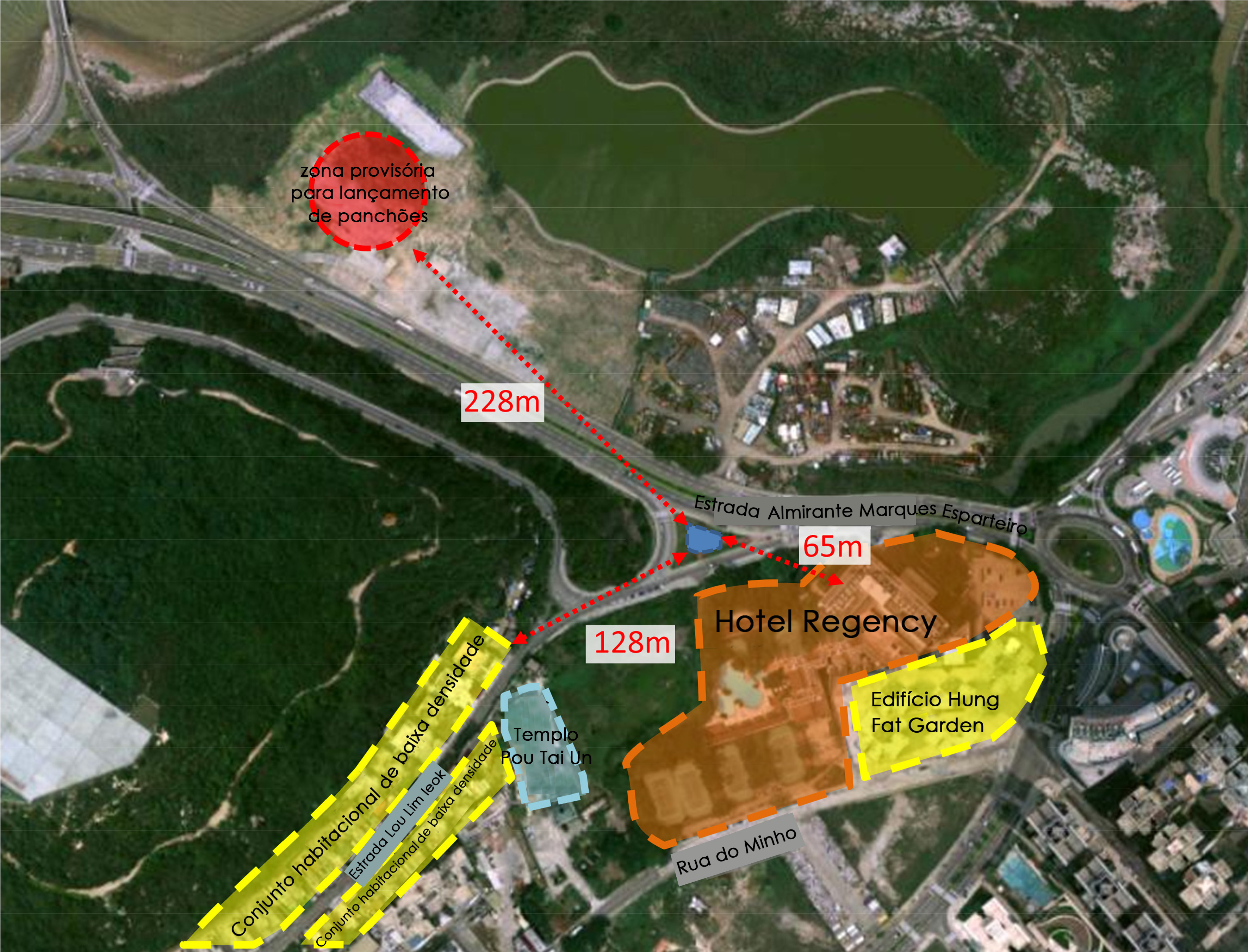 Devido à proximidade do local escolhido com a zona provisória para lançamento de panchões utilizado durante o período do ano novo chinês pelo IACM, a Administração da RAEM está bastante atenta à questão da segurança. Considerando o carácter provisório desta zona para lançamento de panchões, a sua área em concreto e a distribuição das suas zonas funcionais serão ainda melhor definidas em função das necessidades concretas na altura e a situação da estudo e articulação, nomeadamente em termos de previsão do fluxo pedonal e as mudanças no ambiente urbano envolvente, no sentido de garantir o cumprimento da legislação sobre a matéria.