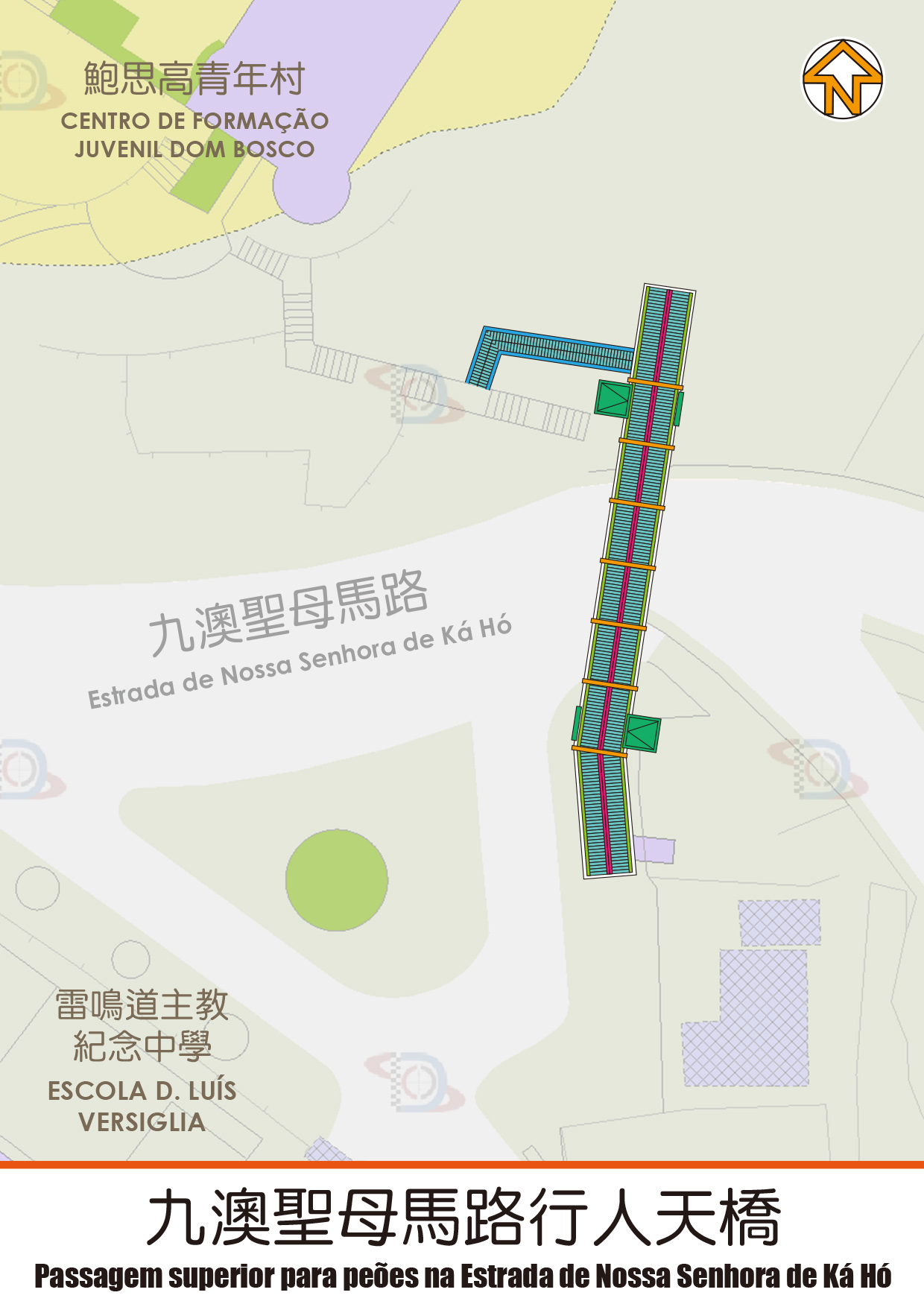 Com a conclusão das obras de alargamento e reformulação viária da Estrada de Nossa Senhora de Ká Hó e face ao previsível aumento progressivo do fluxo rodoviário das suas imediações, a zebra provisória actualmente existente no local será insuficiente para fazer face às futuras necessidades. Assim sendo, em prol da beneficiação dos equipamentos de travessia pedonal desta zona, a DSSOPT construirá na Estrada de Nossa Senhora de Ká Hó uma passagem superior para peões, no sentido de proporcionar aos moradores e estudantes um equipamento de travessia pedonal mais seguro e confortável. Ultimamente os preparativos da obra tiveram início e segundo as estimativas esta poderá estar concluída será concluída no 1.º semestre de 2016.